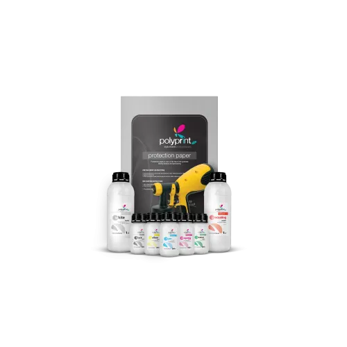 Комплектация: CMYK x 250мл, 1л белые чернила , 1л пропитка, 250 мл чистящая жидкость , 1 упаковка защитной бумаги, 1 распылитель Wagner W550