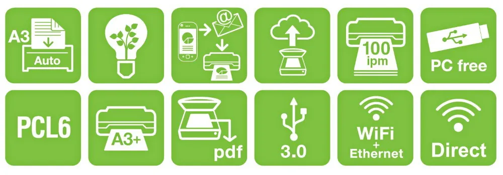 - Автоматическая двусторонняя печать, копирование и сканирование документов;