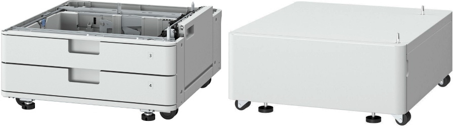 Производитель предлагает два варианта подставок - монолитную тумбу и модуль кассетной подачи бумаги, рассчитанный на 550 листов формата А3. Оба варианта подставок оснащены колёсами и поднимают МФУ на высоту, комфортную для эксплуатации.