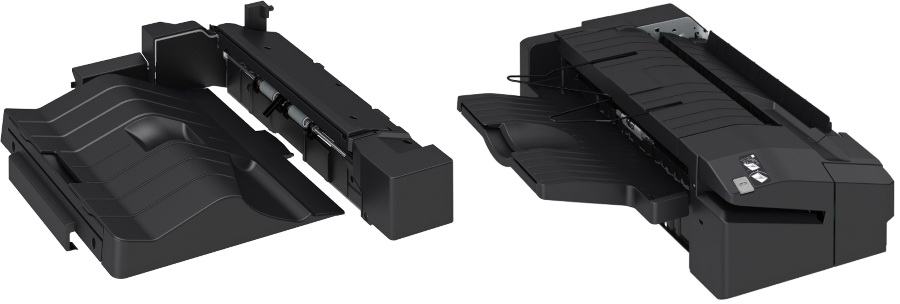 Самая интересная группа опций, доступная для C3520i - финишные устройства, позволяющие выполнять группировку, сдвиг, буклирование, степлирование и перфорацию отпечатков непосредственно на выходе из МФУ, сразу собирая их в готовое изделие - брошюру или книжицу. Для заказа доступны три версии внешних финишеров, имеющих разную производительность. Самым компактным вариантом финишного устройства, доступного для C3520i является внутренний финишер К1. Он монтируется на место штатного выводного лотка и не увеличивает финальные габариты устройства. Он имеет два лотка вместимостью 50 и 250 листов и позволяет осуществлять угловое и двойное степлирование до 50 листов или сортировку/группировку смещением. Кроме того, финишер К1 имеет функцию экосшивания (бесскрепочное сшивание до четырёх листов), тем самым экономя запас скрепок при изготовлении документов малого объёма.