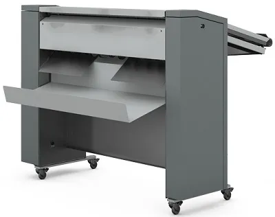 Фальцовщик Oce EsTefold 2400 обрабатывает документы всех размеров до 914 мм шириной и неограниченной длины. Документы длиннее шести метров фальцуются секциями примерно по 22 сложения. Поперечная фальцовка возможна на документах длиной до 1,5 м посредством повторной подачи в специальный лоток. Сложение производится по стандарту DIN, а также другим стандартам. Интегрированная система фальцовки управляется полностью онлайн: это означает, что возможно управление механизмом фальцовки как из драйвера печати, так и с ПО для комплектной печати, и с панели сканера, при этом все управление выполняется постранично. Возможные механизмы фальцовки — как под архив: 210х297, так и с полем под скоросшиватель — 20 мм для дальнейшего использования. Поле под скоросшиватель настраивается с точностью до 1 мм.