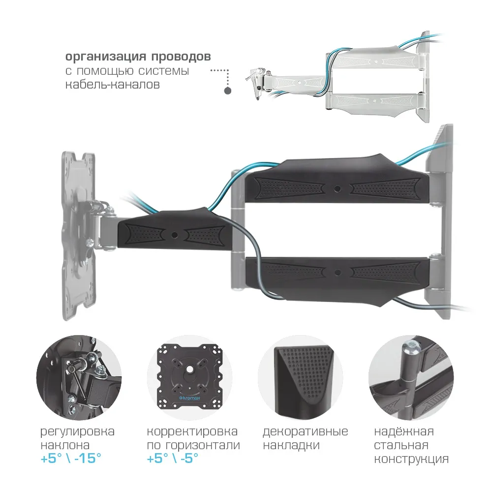 Кронштейн Kromax Atlantis-40 выполнен в сером титановом цвете, делающем его максимально незаметным за телевизором или монитором. Специальные пластиковые накладки скрывают место крепления к стене и придают кронштейну эстетически законченный и элегантный внешний вид. Система шарниров позволяет регулировать положение экрана телевизора, оптимизируя пространство помещения и добиваясь наиболее удобного расположения экрана для просмотра. В комплекте поставки крепления есть вся необходимая фурнитура для монтажа. Кронштейн KROMAX Atlantis-40 имеет пожизненную гарантию.