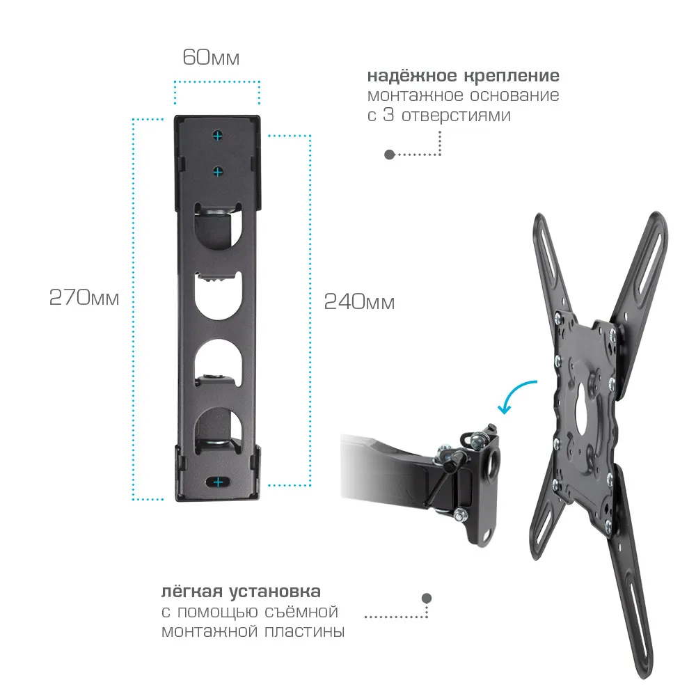 | Дополнительно | Надежная стальная конструкция максимальная нагрузка до 40 кг, Универсальная система крепления, Вращение экрана уникальная возможность вращения экрана на ±5° относительно стены, Легкий монтаж при помощи съемной монтажной пластины , Скрытая система укладки кабеля в специальные кабель-каналы, Декоративные настенные накладки |