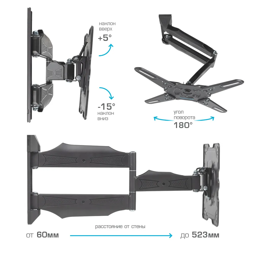 Множество степеней свободы позволяют без специального инструмента менять положение телевизора: поворачивать, наклонять, двигать экран в разных направлениях, не прилагая усилий, обеспечивая отличные возможности для настройки угла просмотра.