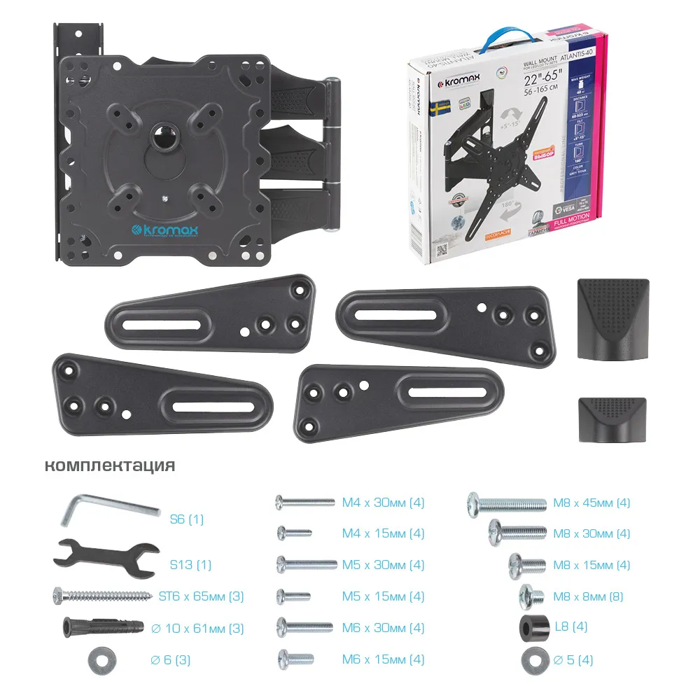 Кронштейн Kromax Atlantis-40 подходит для телевизоров с диагональю от 22 до 65 дюймов.
