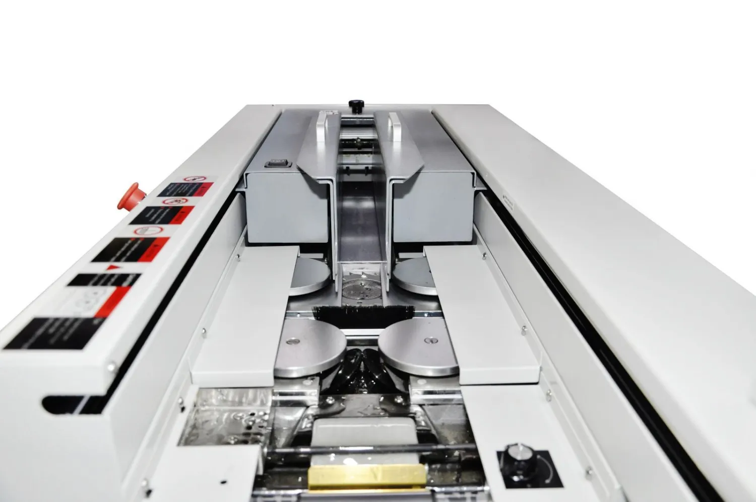 - Ролики боковой проклейки имеют свою отдельную клеевую ванну, с отдельным нагревателем, термостатом, датчиком температуры. Благодаря этому вы можете использовать разные типы клеев с разной рабочей температурой для проклейки корешка и боковой проклейки;