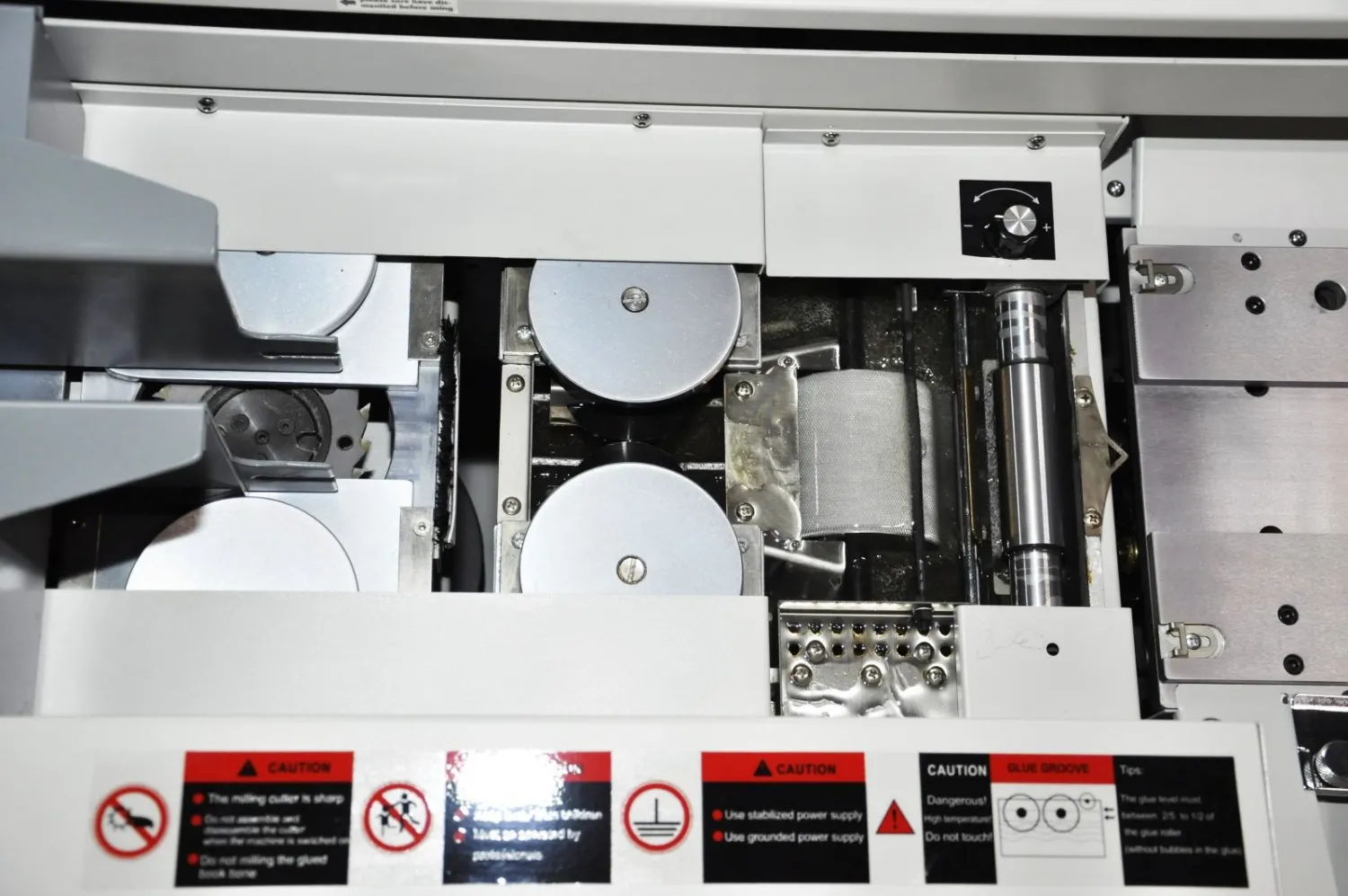 - Неравномерность приклеивания обложки можно быстро отрегулировать с помощью поворота двух рукояток справа; - Бумажная пыль от фрезерования и тошонирования собирается в мешок специальным вентилятором, благодаря чему не смешивается с клеем и не ухудшает качества проклейки;