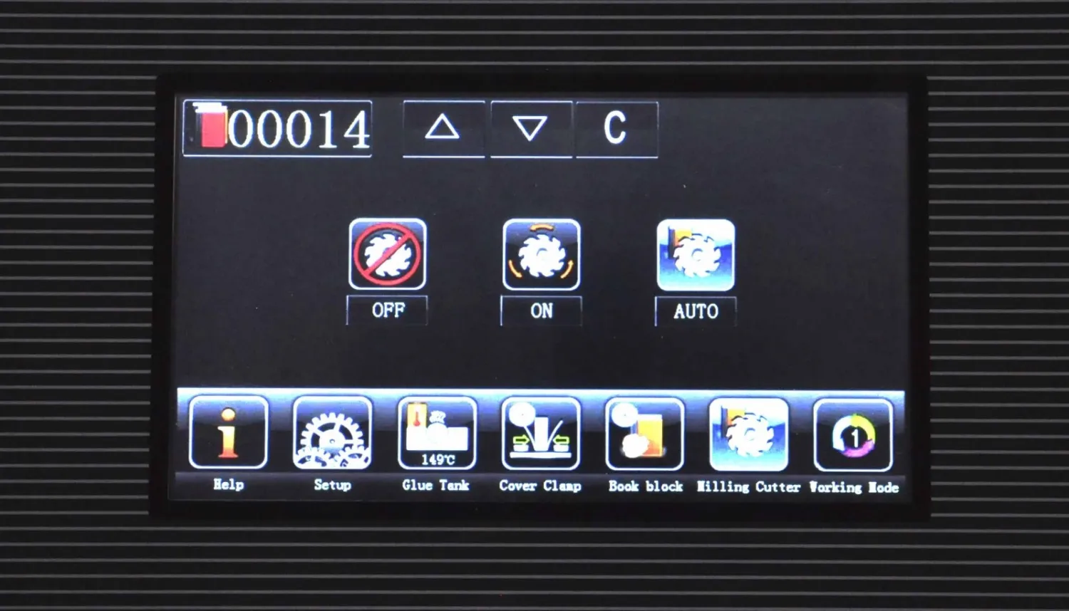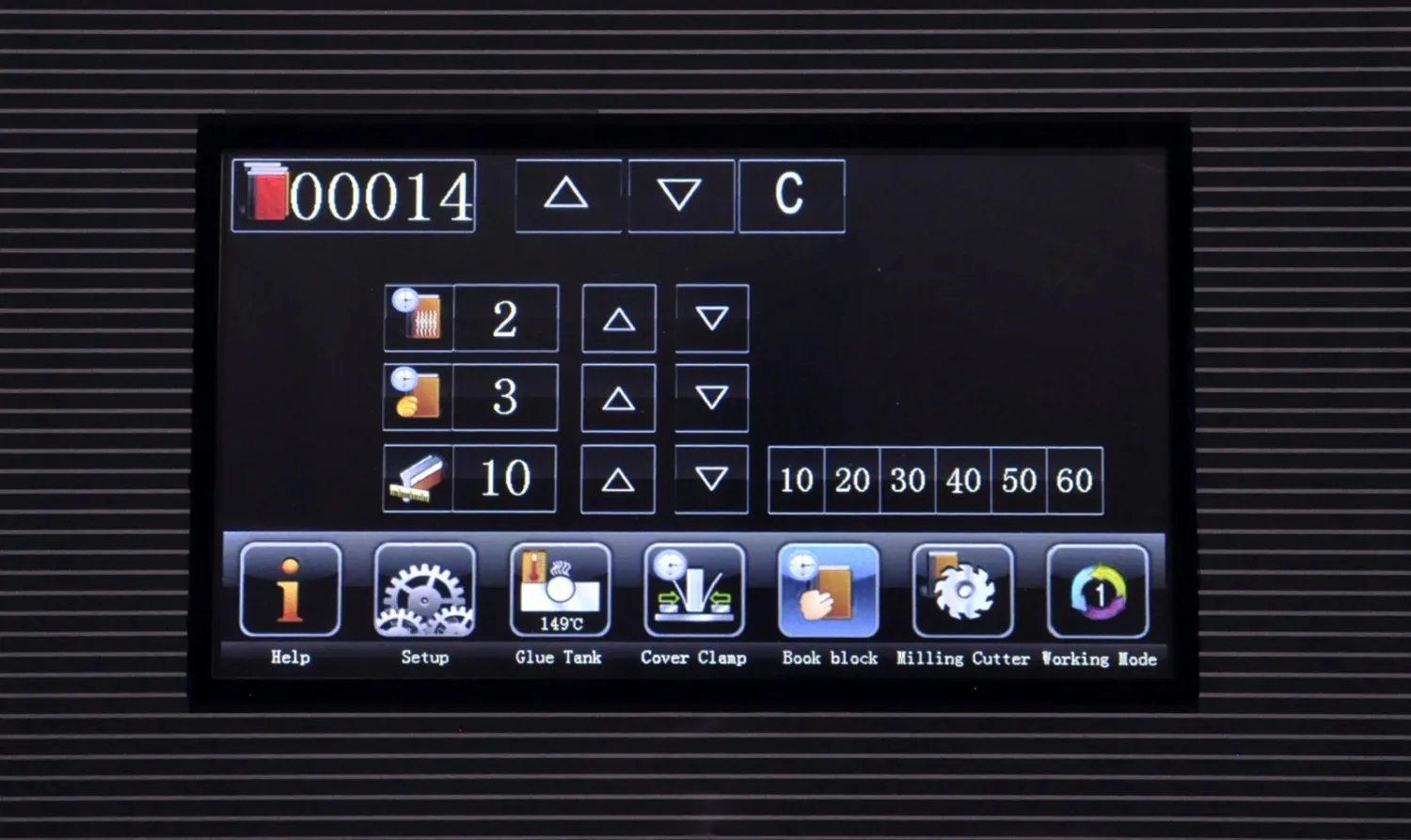 | Дополнительные характеристики | боковая проклейка двумя дополнительными роликами, фрезерование 0.0-2.0 мм, (фреза 9 зубцов (9 торшонирующе-фрезеровальных ножей)), вал удаления излишков клея подогреваемый, автоматический обжим обложки, регулировка усилия прижима обложки, регулировка неравномерности прижима обложки, линейное перемещение станции зажима книги, полноцветный сенсорный LCD дисплей, мешок для сбора бумажной стружки, рабочий стол для обложек, дополнительный вентилятор клеевой ванны, вибрация стола под книжным блоком (станция зажима книжного блока), регулятор ширины книжного блока для предварительного открытия защитных шторок. |