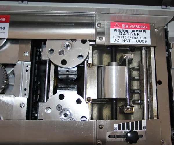 Принцип работы термоклеевой машины:- Выровнять блок бумаги, поместить в обжимной стол термопереплетчика и обжать его (возможно автоматическое обжатие блока).