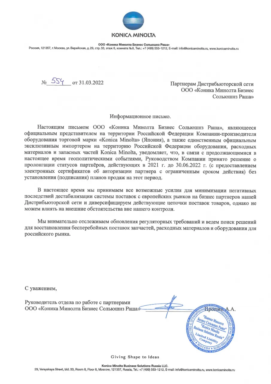 Компания Ofitrade имеет статус сертифицированного партнёра компании Konica Minolta! Мы предлагаем нашим клиентам решения этого производителя уже 4 года, поставляя официально сертифицированное, надёжное и проверенное оборудование Konica Minolta, защищённое гарантией. Наш статус позволяет Вам получать ещё больше выгоды при покупке устройств всего модельного ряда Konica Minolta в нашем магазине!
