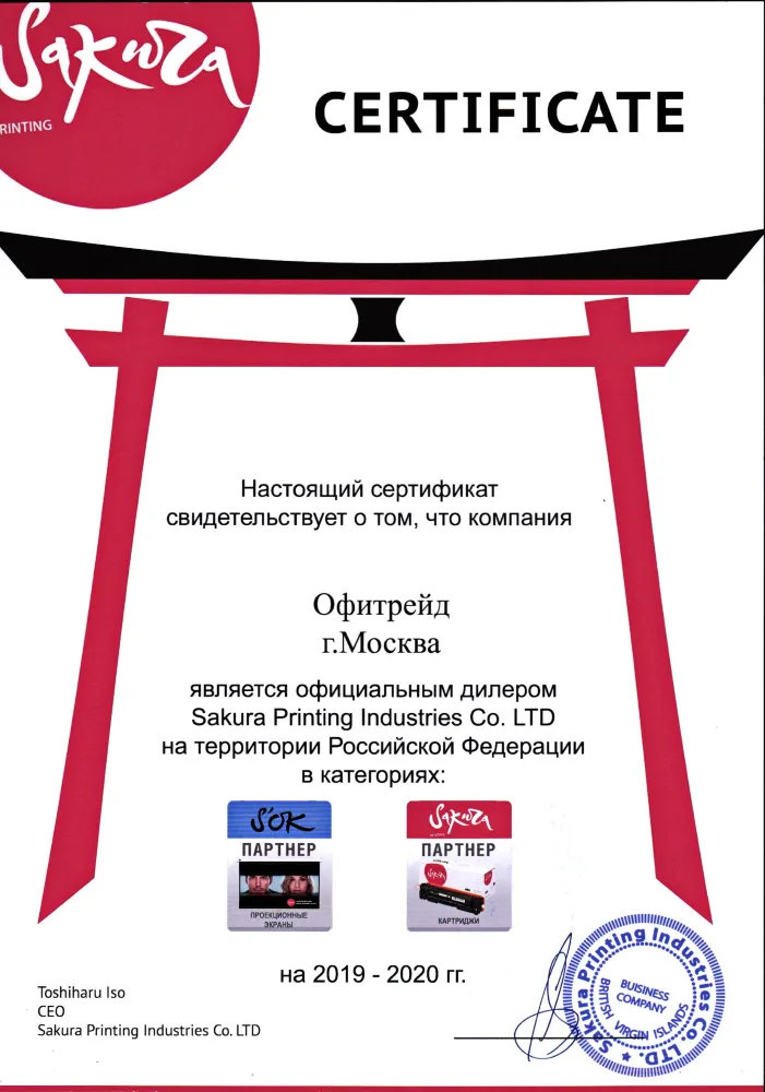 Ofitrade является официальным дилером продукции Sakura на территории Российской Федерации в категориях "Картриджи" и "Проекционные экраны". Статус официального дилера позволяет Ofitrade предлагать продукцию Sakura на более выгодных условиях.