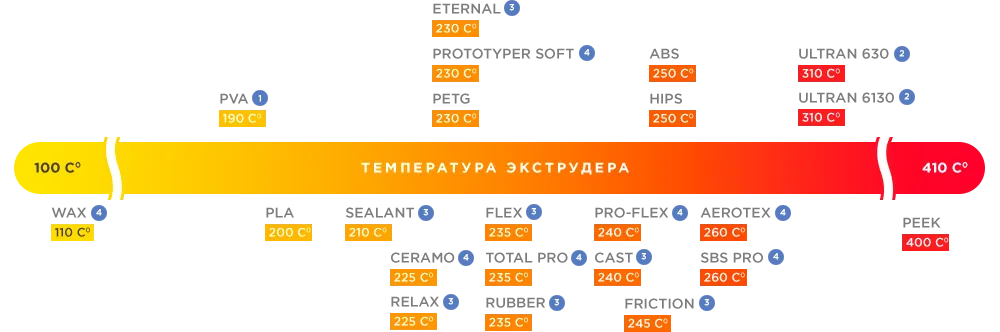 | Материалы печати | ABS, PLA, HIPS, PVA, ULTRAN 630, ULTRAN 6130, ASA, ABS/PC, PET, PC, FRICTION, CAST, RELAX, ETERNAL, FLEX, RUBBER, SEALANT, PETG, AEROTEX, CERAMO, WAX, SBS, SBS PRO, PROTOTYPER SOFT, PRO-FLEX, TOTAL PRO, NYLON, PEEK и другие |