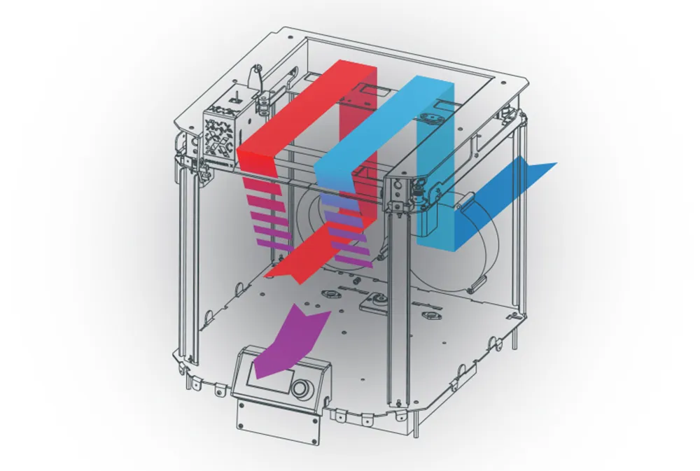 Правильное распределение воздушных потоков обеспечивается системой из двух мощных и бесшумных вентиляторов. Они создают необходимый микроклимат для каждого конкретного материала, что позволяет печатать детали сложной формы с высоким качеством и стабильностью.