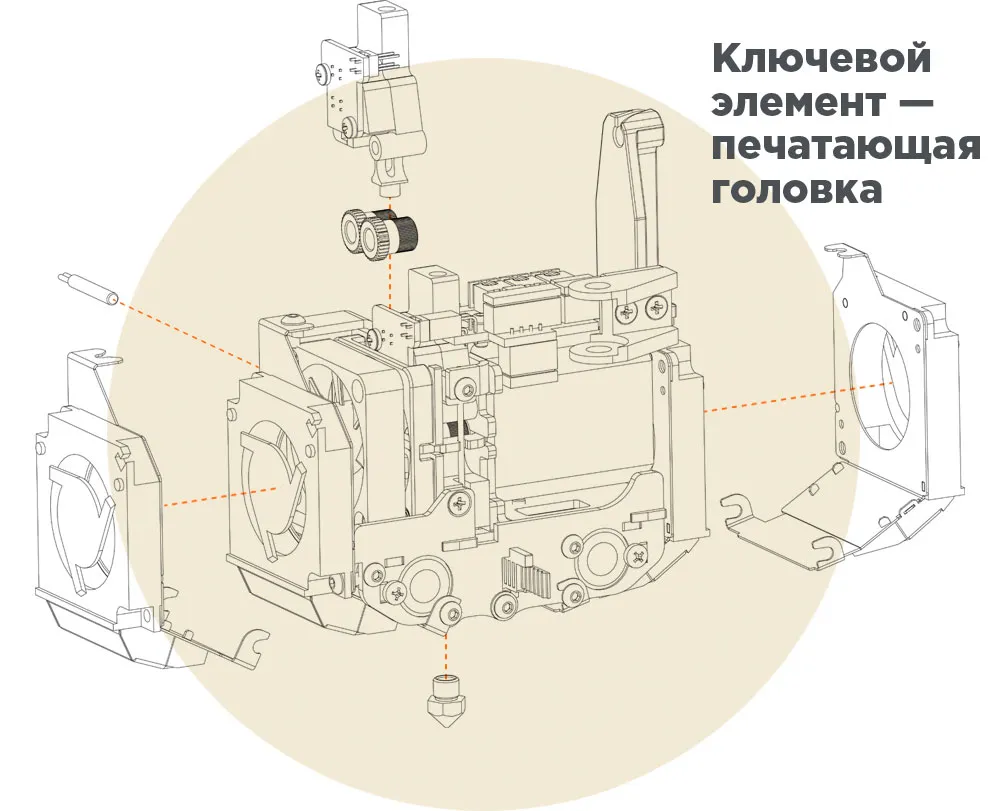 - Двойная система обдува детали. Позволяет максимально эффективно использовать возможности односопельного принтера и печатать без поддержки детали с нависающими элементами.