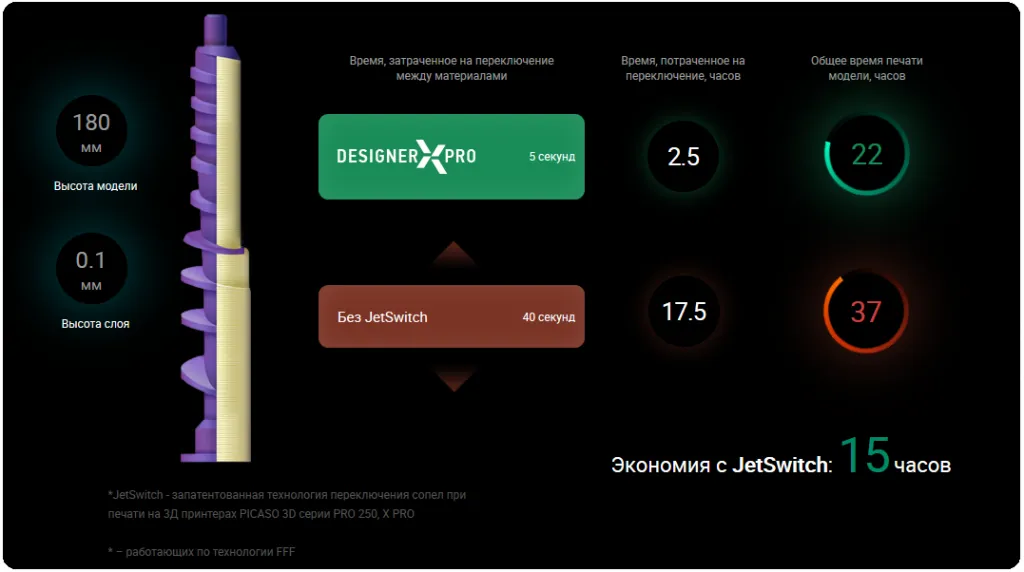 Заново спроектированная печатающая головка с точностью переключения до 1 мкм (точность позиционирования сопел при переключении между материалами составляет 0.001 мм ± 0.0025 мм (точность измерительного инструмента), рамная конструкция, точная механика и аппаратная платформа следующего поколения сделают Вашу печать невероятно качественной.