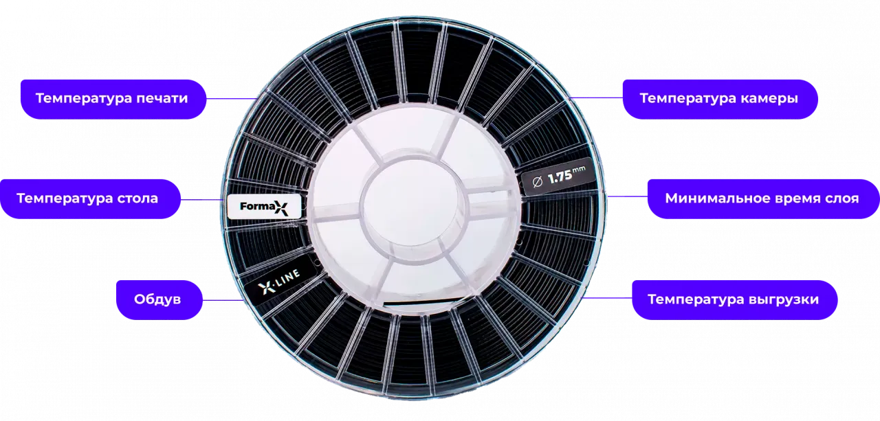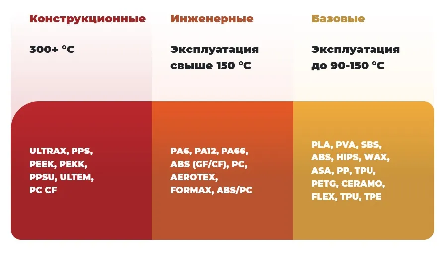 ABS, PLA, ASA, PP, TPU, PETG, HIPS — базовые материалы, которыми можно печатать на всю камеру с наилучшими показателями межслойной адгезии и минимальными отклонениями от цифровой модели.