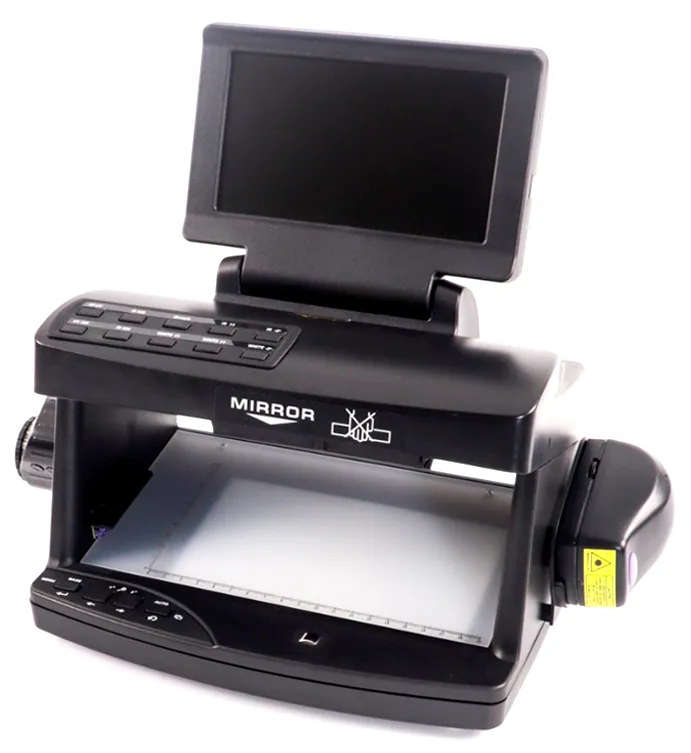 Имеет увеличенную рабочую зону над предметным столом с просветным экраном, на который нанесена шкала для оценки величины исследуемых объектов. На лицевой панели прибора расположены кнопки управления увеличением камеры, базой данных эталонов паспортов или валют, автоматическим режимом переключения источников света.