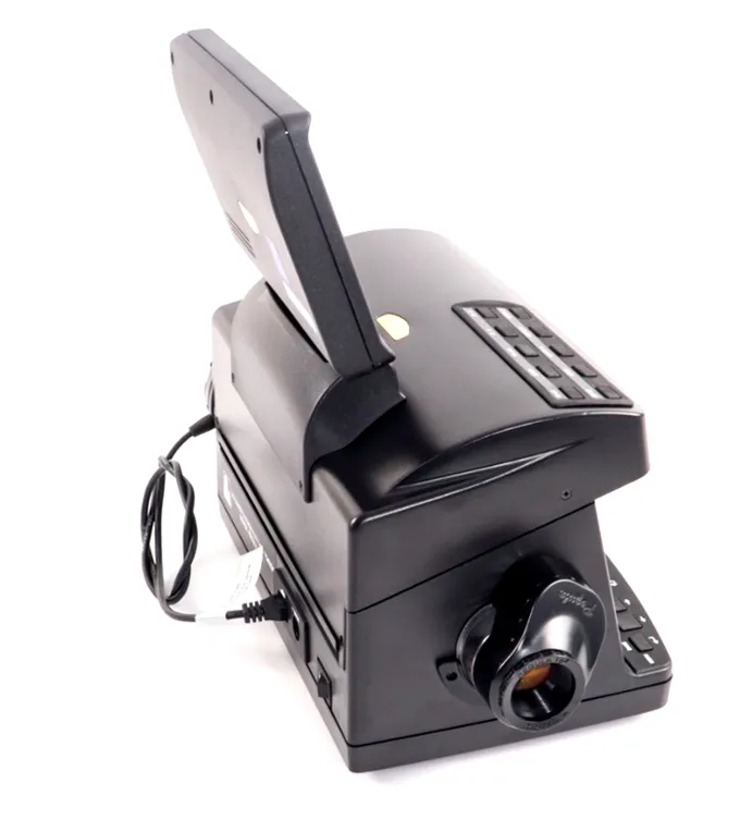 Модель в виде малогабаритного блока. Корпус из пластмассы. Переключатели источников света для различных режимов исследования расположены на верхней части прибора. Прибор оборудован встроенной камерой, выводящей изображение на монитор. Для транспортировки или хранения монитор может складываться.