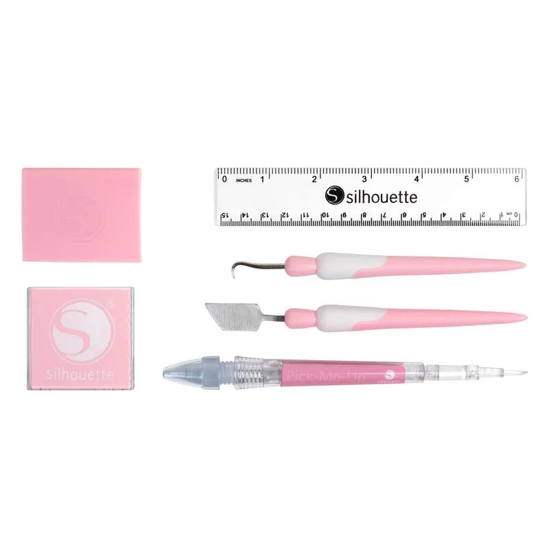 Набор инструментов представлен из монтажного крючка для выборки вырезанных деталей из самоклеящейся и термотрансферной пленки, универсального скребка снятия ненужных деталей с керриера или приглаживания пленки на керриер, шпателя, позволяющего снять тонкие материалы с керриера, инструмента Pick-Me-Up® для захвата и размещения мелких предметов (например, страз), 15-сантиметровой прозрачной линейки и ткани из микрофибры для очистки ЖК-экрана вашего плоттера.