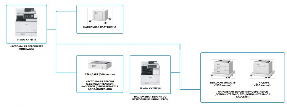 Canon iageRUNNER ADVANCE C475i III MFP имеет модульную конструкцию, которая позволяет максимально адаптировать МФУ к конкретным условиям работы, устанавливая необходимые опциональные модули. На выбор предлагаются несколько вариантов напольных платформ на колёсиках, которые отличаются количеством единовременно размещаемых листов бумаги, а также настольные модульные подставки с кассетами для бумаги по 500 листов каждая. Кроме того, для заказа доступна модификация imageRUNNER ADVANCE C475iZ III MFP, которая отличается от базовой версии наличием встроенного финишера.