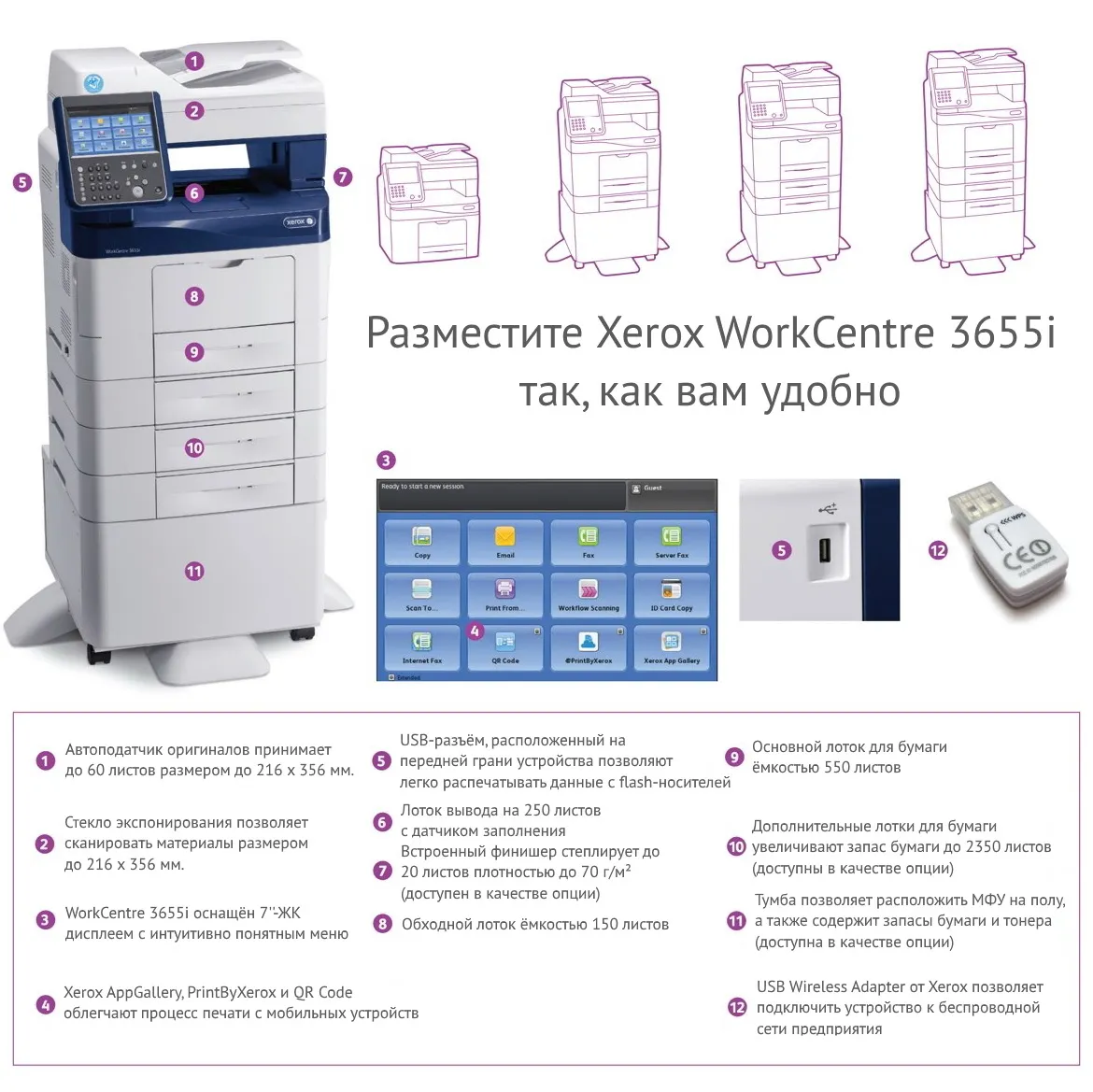 Xerox WorkCentre 3655 предоставляет возможность гибко встроить этот МФУ в офисное информационное пространство. Это многофункциональное устройство обеспечивает удобный доступ к рабочим инструментам различными способами: