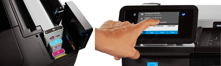 - Устройство оснащено сенсорным экраном с диагональю 4,3" и интуитивно понятным интерфейсом. Доступ к основным функциям устройства может быть получен с помощью пары нажатий сенсорных клавиш, ускоряя работу и позволяя обслуживать МФУ силами одного сотрудника. Управление HP DesignJet T830 покажется простым и привычным любому владельцу современного смартфона.