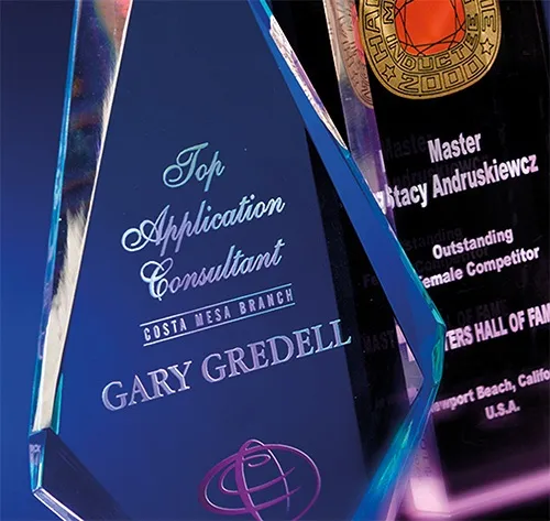 Разнообразие возможностей машины DE-3 позволяет наносить надписи и графику на награды из акрила и вывески.