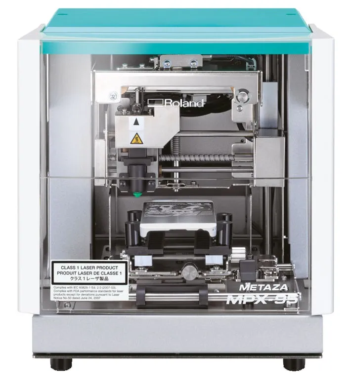 Roland METAZA MPX-95 новое поколение фотопринтеров. MPX-95 благодаря головке с установленной алмазной иглой, способной поддерживать разрешение фотопечати 529 dpi (и 1058 dpi в режиме гравировки), MPX-95 позволит создавать реалистичную фотогравировку на самых разнообразных исзделиях, от брелоков жетонов и подвесок до зажигалок Zippo. Печатающая головка MPX-95 обладает силой удара в 2,5 раза выше чем у предшественников, что незаминимо при создании векторной гравировки. METAZA способна наносить гравировку на самые разнообразные металлы создавая как подарочные надписи как на различных сувенирных изделиях, так и маркировку на различных промышленных изделиях. Благодаря плавающей головке MPX-95 может наносить гравировку как плоские так и искривленные поверхности. При этом конструкция фотопринтера реализована таким образом, что заготовка неподвижна закреплена на стола, а головка перемещается над ней, что позволяет наносить гравировку на заготовки неограниченных размеров.