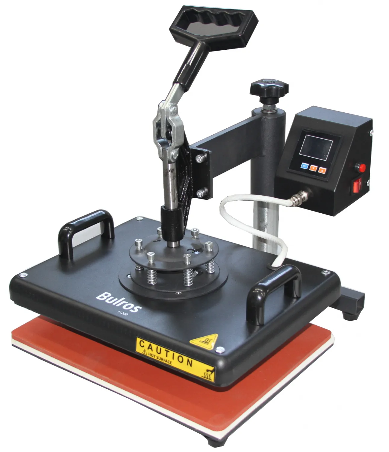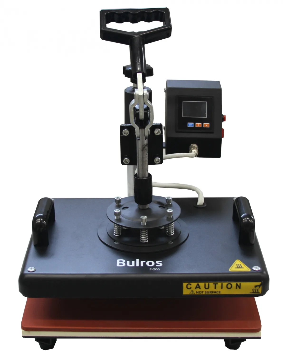 Плоский термопресс F-200 имеет простую, но одновременно надежную конструкцию. Встроено 6 нагревательных тенов. Уникальную система электронного контроля температуры 90-225 °C и времени (таймер 0-999 S) реализованную современным микрочипом — дает большую точность и скорость настроек.