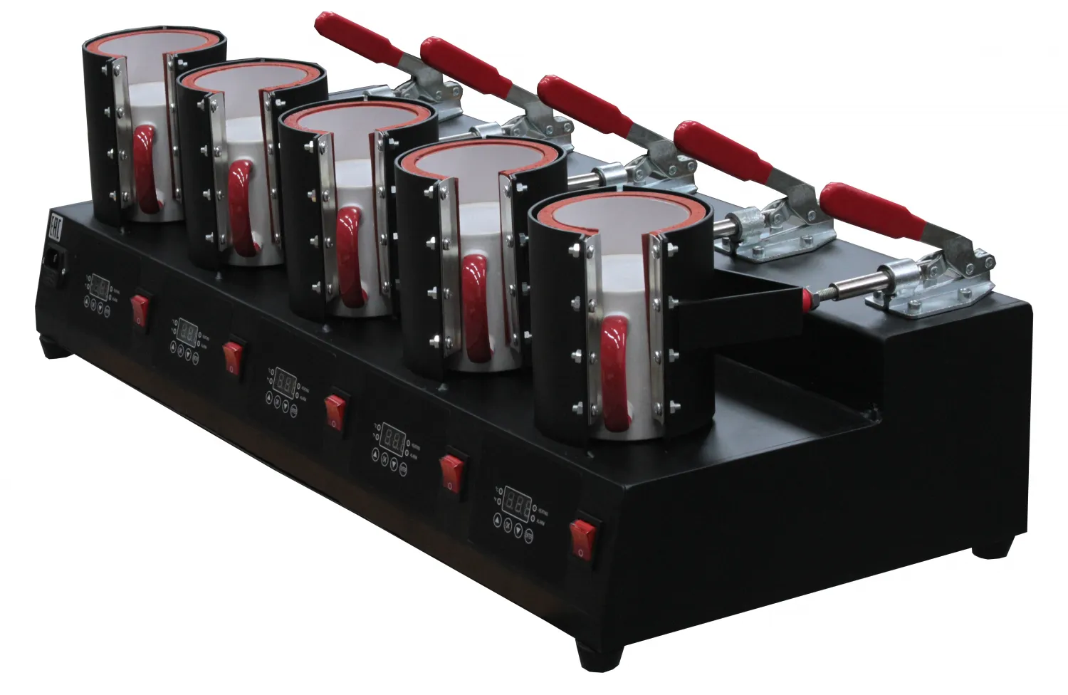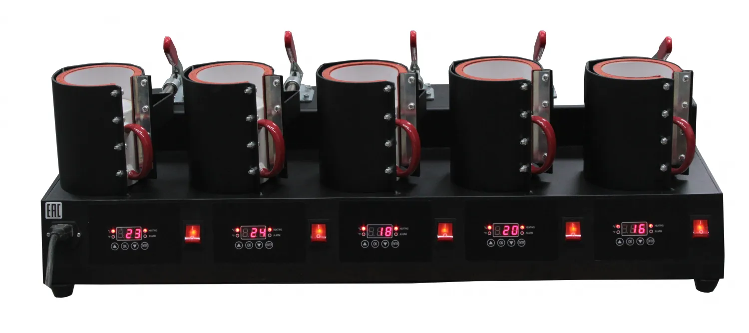 Кружечные термопрессы T-205T имеют простую, но одновременно надежную конструкцию. Имеют гибкий нагревательный элемент для кружек d: 75-90 мм, цилиндрическую форму рабочего органа, уникальную систему электронного контроля температуры для каждой кружки 90-220 °C и времени (таймер 0-400 S) реализованную современным микрочипом — это дает большую точность и скорость настроек.