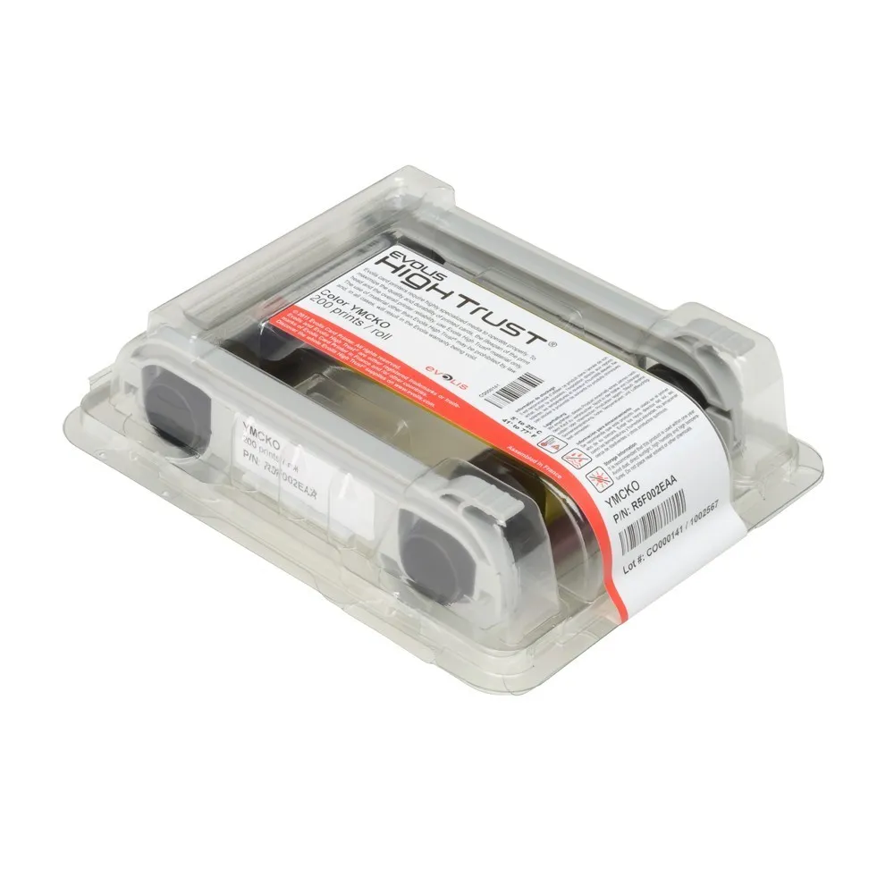 Можете использовать ленту Evolis YMCKO для каждой одно- или двусторонней печати