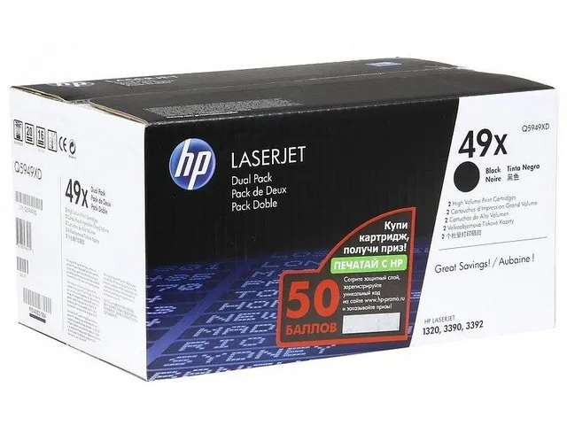 Черные картриджи HP Q5949XD в двойной упаковке для LaserJet 1320.Количество страниц (ч/б) Средний ресурс картриджа — 6000 стандартных страниц.