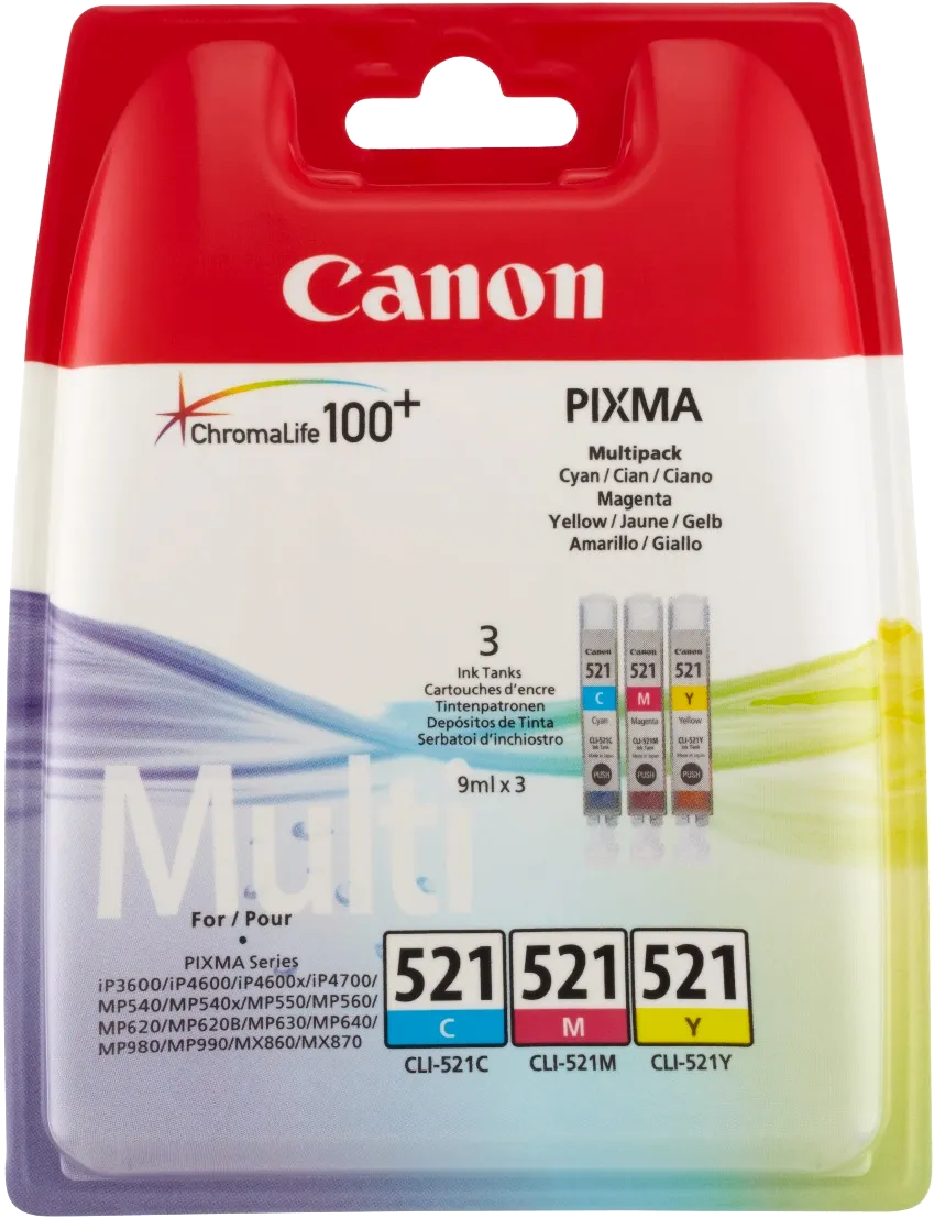 Набор картриджей многоцветный Canon CLI-521, 3 картриджа для PIXMA iP3600, iP4600, iP4600x, iP4700, MP540, MP540x, MP550, MP560, MP620, MP620B, MP630, MP640, MP980, MP990, MX860, MX870 (9 мл.)