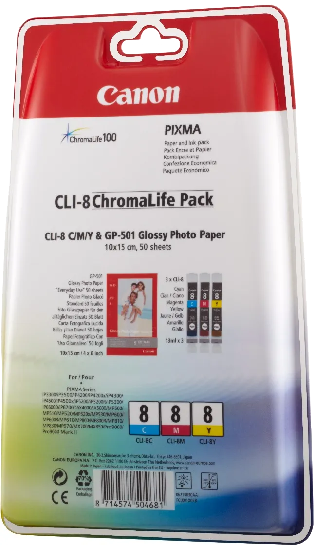 Набор картриджей многоцветный Canon CLI-8 C/M/Y, 3 картриджа для PIXMA iP3300, iP3500, iP4200, iP4200x, iP4300, iP4500, iP4500x, iP5200, iP5200R, iP5300, iP6600D, iP6700D, iX4000, iX5000, MP500, MP510, MP520, MP520x, MP530, MP600, MP600R, MP610, MP800, MP800R, MP810, MP830, MX700, MX850, Pro9000, Pro9000 Mark II (13 мл.)