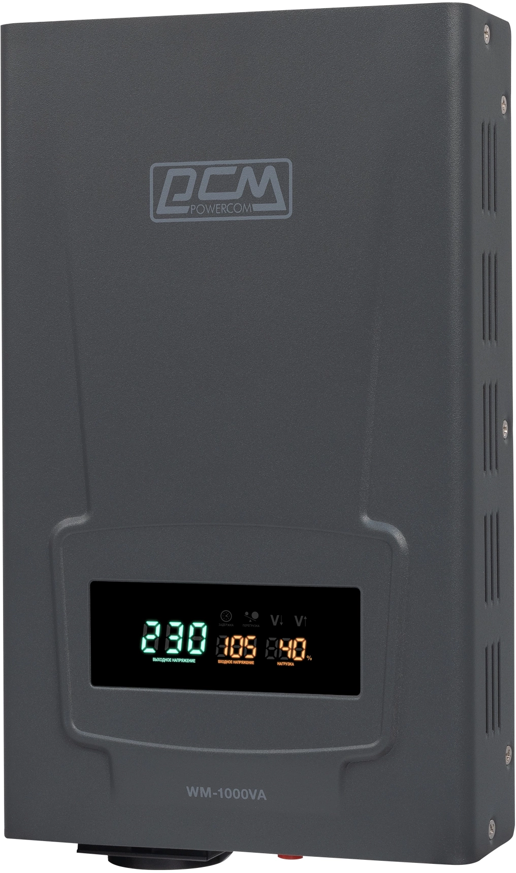 Automatic Voltage Regulator (AVR) – англ. Автоматический стабилизатор напряжения – электронное устройство на основе автотрансформатора с переключаемыми обмотками. Предназначено для регулировки входного напряжения в сторону повышения (режим boost) или понижения (режим buck). Он осуществляет ступенчатую корректировку входного напряжения в сторону его повышения (при пониженном входном напряжении) или понижения (при повышенном входном напряжении). Стабилизатор напряжения предназначен для обеспечения качественным и стабильным электропитанием разных потребителей, защиты устройств-потребителей от недопустимых отклонений питающего напряжения, высокочастотных и импульсных помех. Настенный стабилизатор напряжения WM-1000VA предназначен для питания бытовых электроприборов стабилизированным напряжением в условиях отклонения напряжения однофазной электросети ниже или выше допустимого значения. Стабилизаторы обеспечивают защиту подключенных потребителей и осуществляют их безопасное пере подключения после сбоев электроснабжения. Расширенный диапазон входного напряжения (~105 – 285 ± 3% В) позволяет обеспечивать электроснабжение устройств- потребителей даже в условиях критического состояния энергоснабжения. Применение микропроцессора в электронной схеме стабилизатора позволило реализовать следующий набор функций – повышенная точность стабилизации выходного напряжения, отображение текущего значения входного/выходного напряжения на LED-дисплее лицевой панели, отображение состояния стабилизатора, функция «ПАУЗА» с регулируемой задержкой подачи электропитания (в течение 6 или 180 с) при его возобновлении, защита от повышенного/пониженного напряжения в сети, от высокочастотных и импульсных помех, защита стабилизатора от перегрузки и короткого замыкания. Кроме перечисленного, стабилизаторы имеют встроенную тепловую защиту автотрансформатора. Стабилизаторы напряжения WM-1000VA имеют привлекательный современный дизайн, а также возможность для настенного крепления. Конструктивно реализован в прочном металлическом корпусе (толщиной всего 7.2 см), что позволяет устанавливать их не только в технических помещениях, но и в непосредственной близости от подключенных устройств.