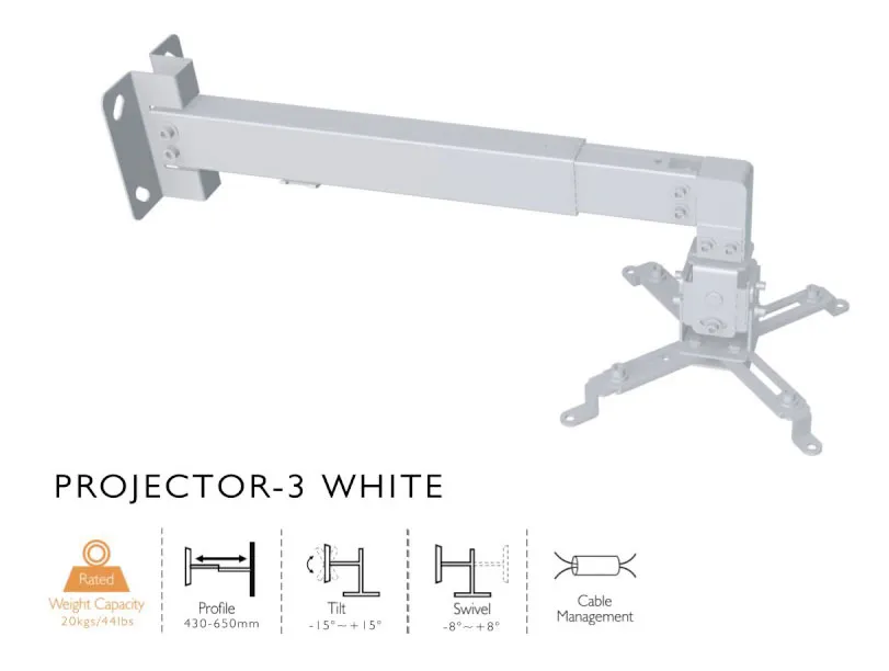 Надежный настенный кронштейн для видео проекторов ARMmedia Projector-3 произведен из качественных и прочных материалов, рассчитанный на максимальную нагрузку до 20 кг. Отличная маневренность: регулируемая высота от потолка до проектора 120 мм (без штанги) и 430-650 мм (со штангой), вниз или вверх в диапазоне от +15° до -15°, изменение угла поворота от +8° до -8°, а также два способа крепления на выбор – к стене или потолку, что обеспечивает максимально комфортный для пользователя просмотр. Белая расцветка позволяет органично вписать кронштейн в Ваш интерьер.