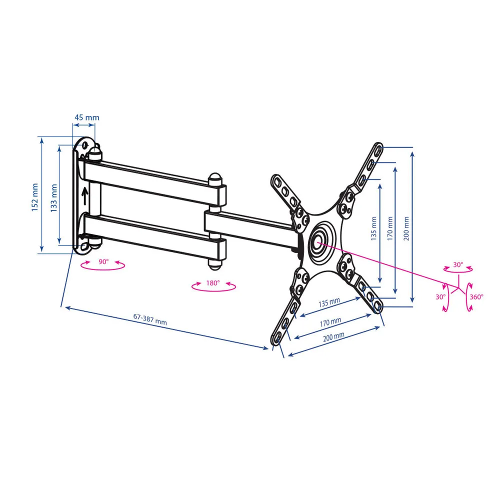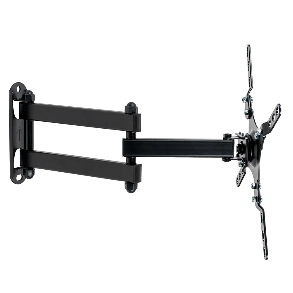 Стальной наклонно-поворотный кронштейн для LED/LCD телевизоров, с диагональю экрана от 15 до 42 дюймов (38-107 см) и максимальным весом до 20 кг. Кронштейн имеет несколько степеней свободы – поворот, наклон, сдвиг. Уникальная возможность - экран ТВ можно вращать на 360° относительно стены и установить его в вертикальном (портретном) положении, что делает его использование с монитором, крайне удобным. К стене складываться на максимально близкое расстояние до 67 мм или отодвигается от нее на максимально возможное расстояние до 387 мм, при помощи двух коленной конструкции. Легкий и быстрый монтаж на стену, благодаря наличию съемной монтажной пластины, у кронштейна предусмотрена уникальная возможность 3D вращения экрана. Максимальные посадочные отверстия по горизонтали - 100 мм, по вертикали - 100 мм. Поддерживаемые стандарты VESA: 75 x 75, 100 x 100.