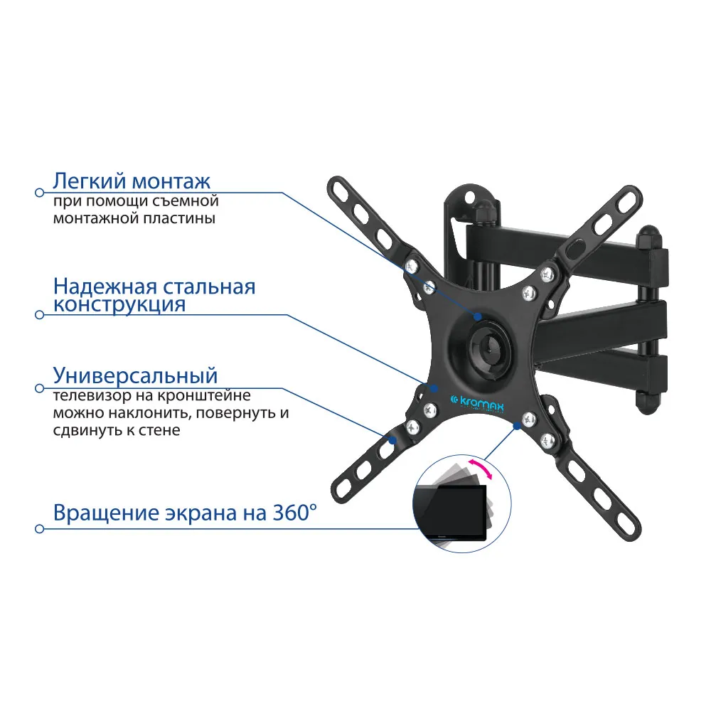 | Дополнительно | Легкий монтаж при помощи съемной монтажной пластины, Надежная стальная конструкция, Универсальный телевизор на кронштейне можно наклонить, повернуть и сдвинуть к стене , Вращение экрана на 360° |