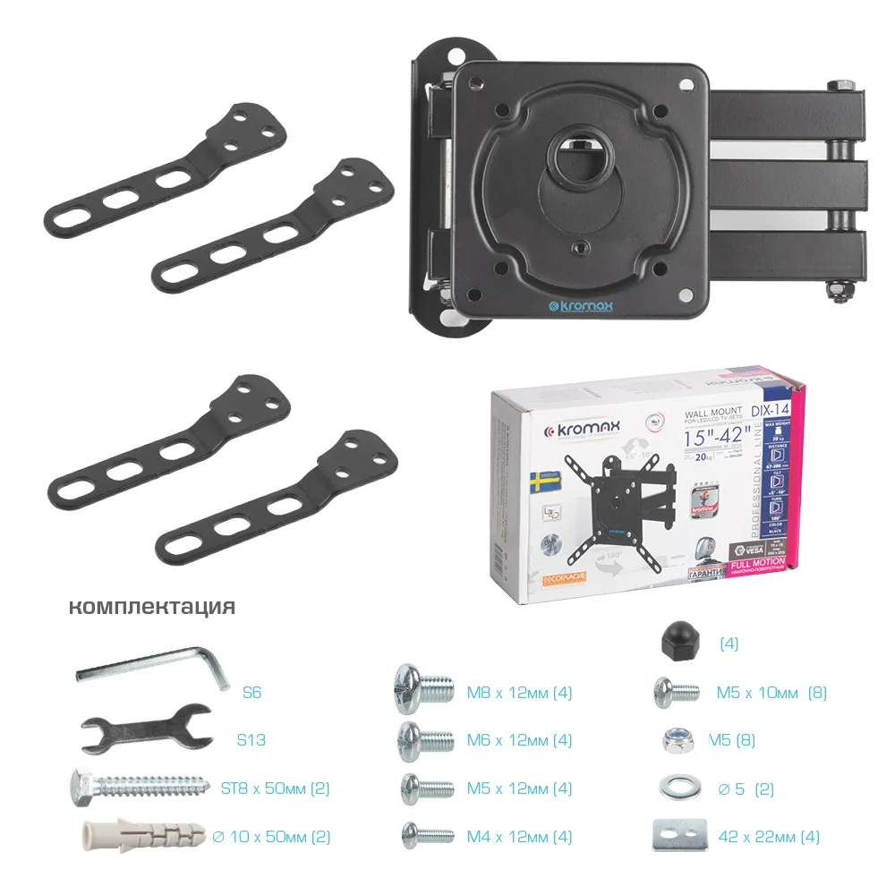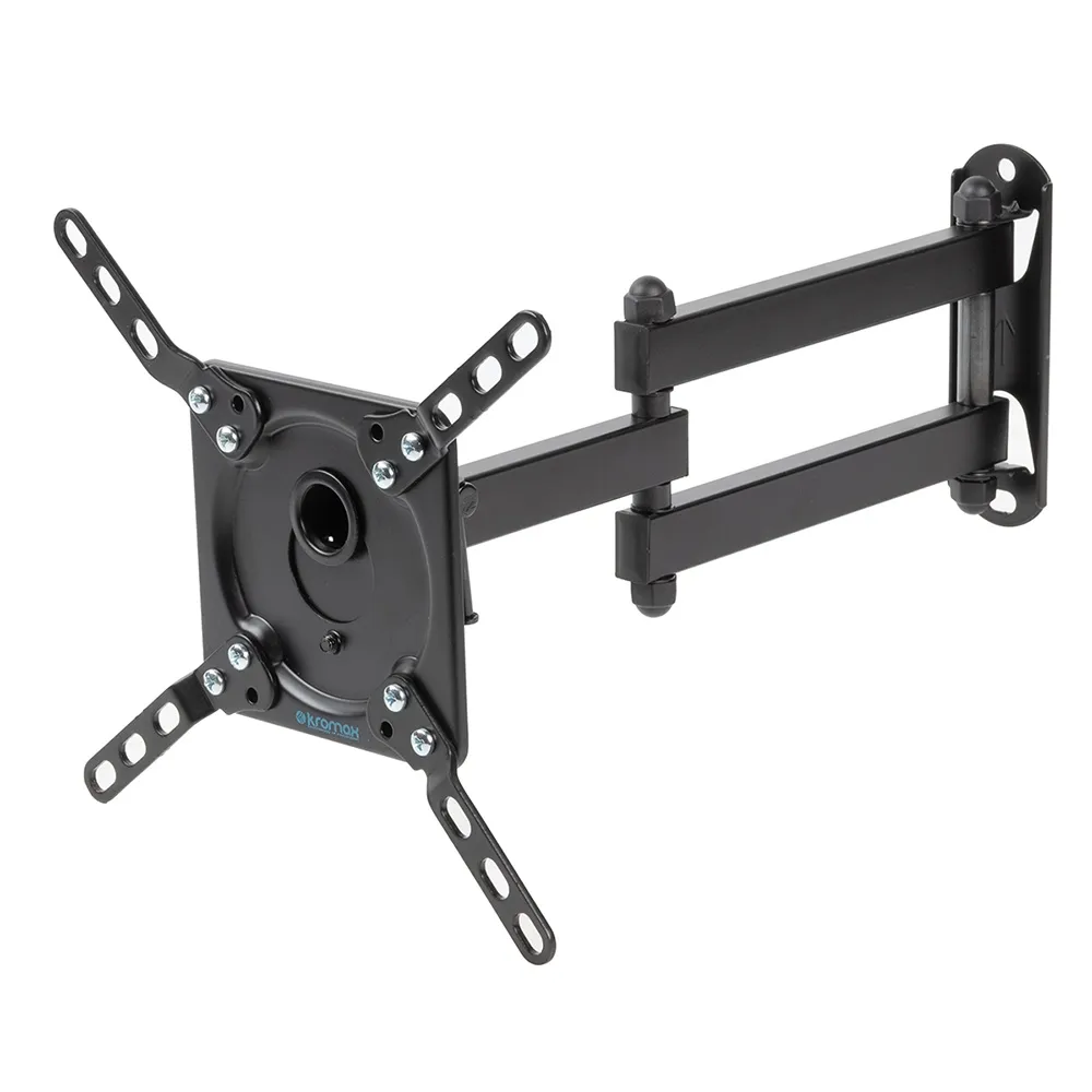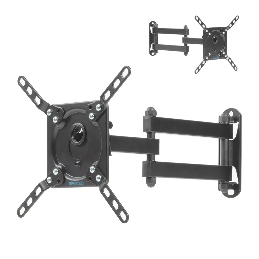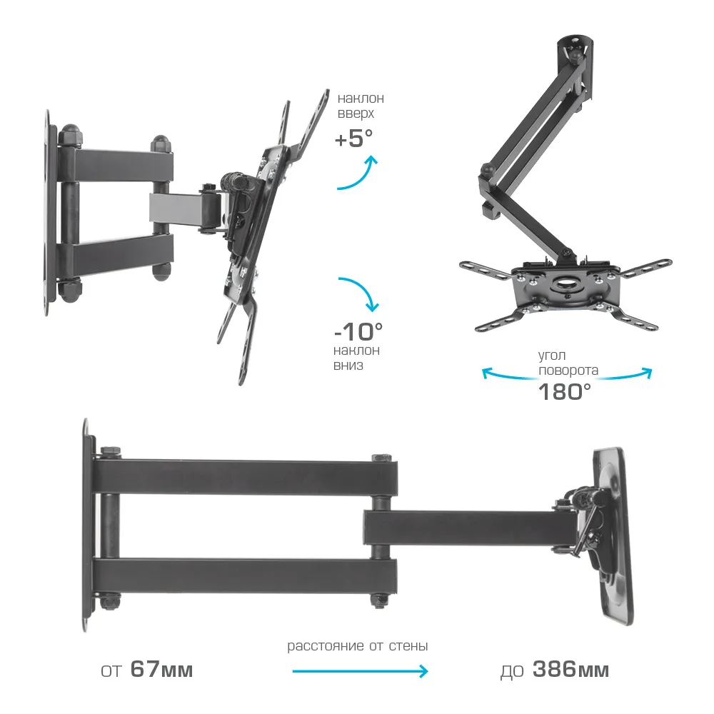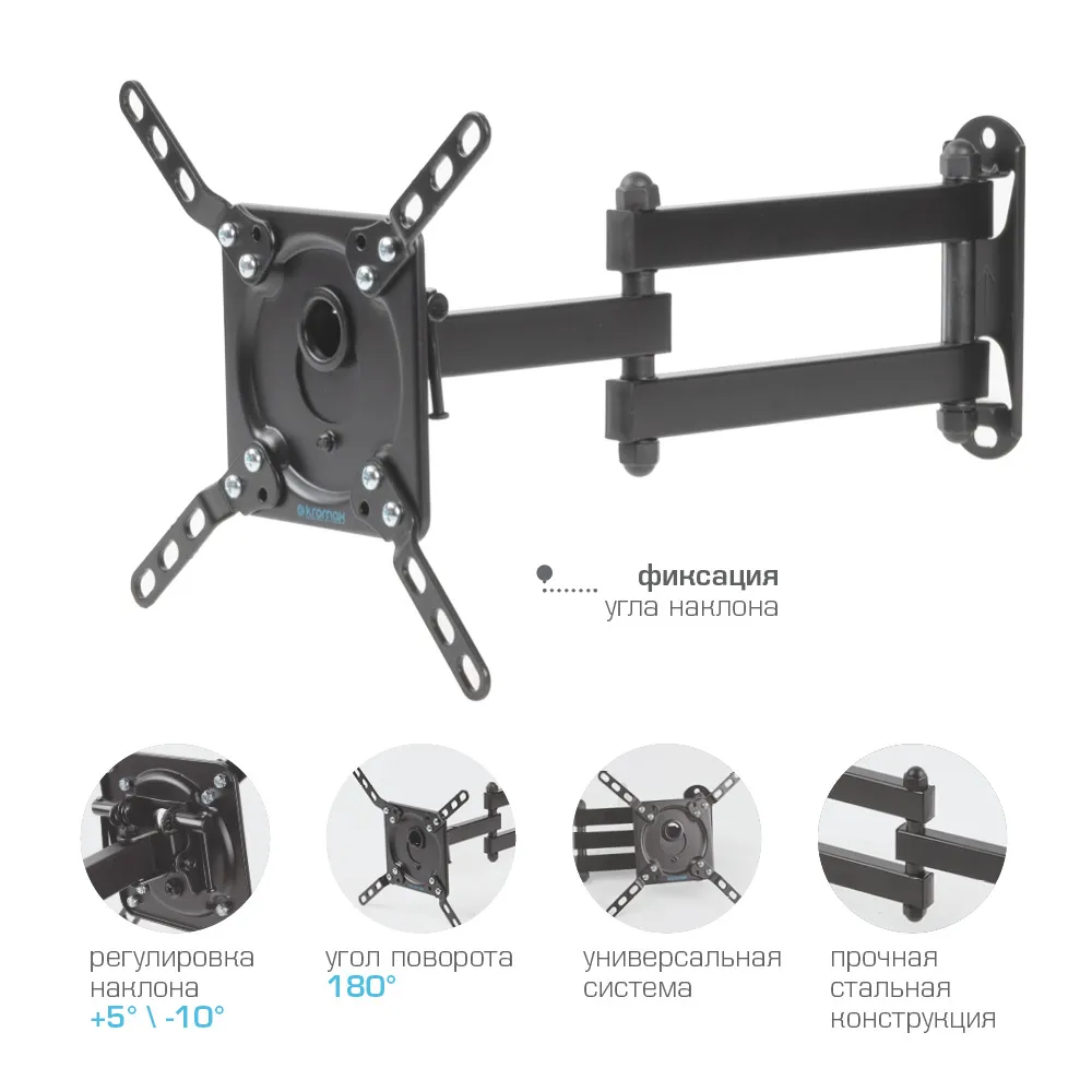Стальной наклонно-поворотный кронштейн для LED/LCD телевизоров, с диагональю экрана от 15 до 42 дюймов (38-107 см) и максимальным весом до 20 кг. Многофункциональный кронштейн позволит наклонять и поворачивать экран вашего телевизора, а так же сдвигать к стене при помощи двухколенной конструкции на максимально близкое расстояние до 67 мм или отодвигать от нее на максимально возможное расстояние до 386 мм. Вы легко можете установить ТВ в угол комнаты или кухни. Надежная стальная конструкция способна выдерживать большие эксплуатационные нагрузки. Без использования инструментов можно зафиксировать угол наклона благодаря уникальному механизму.