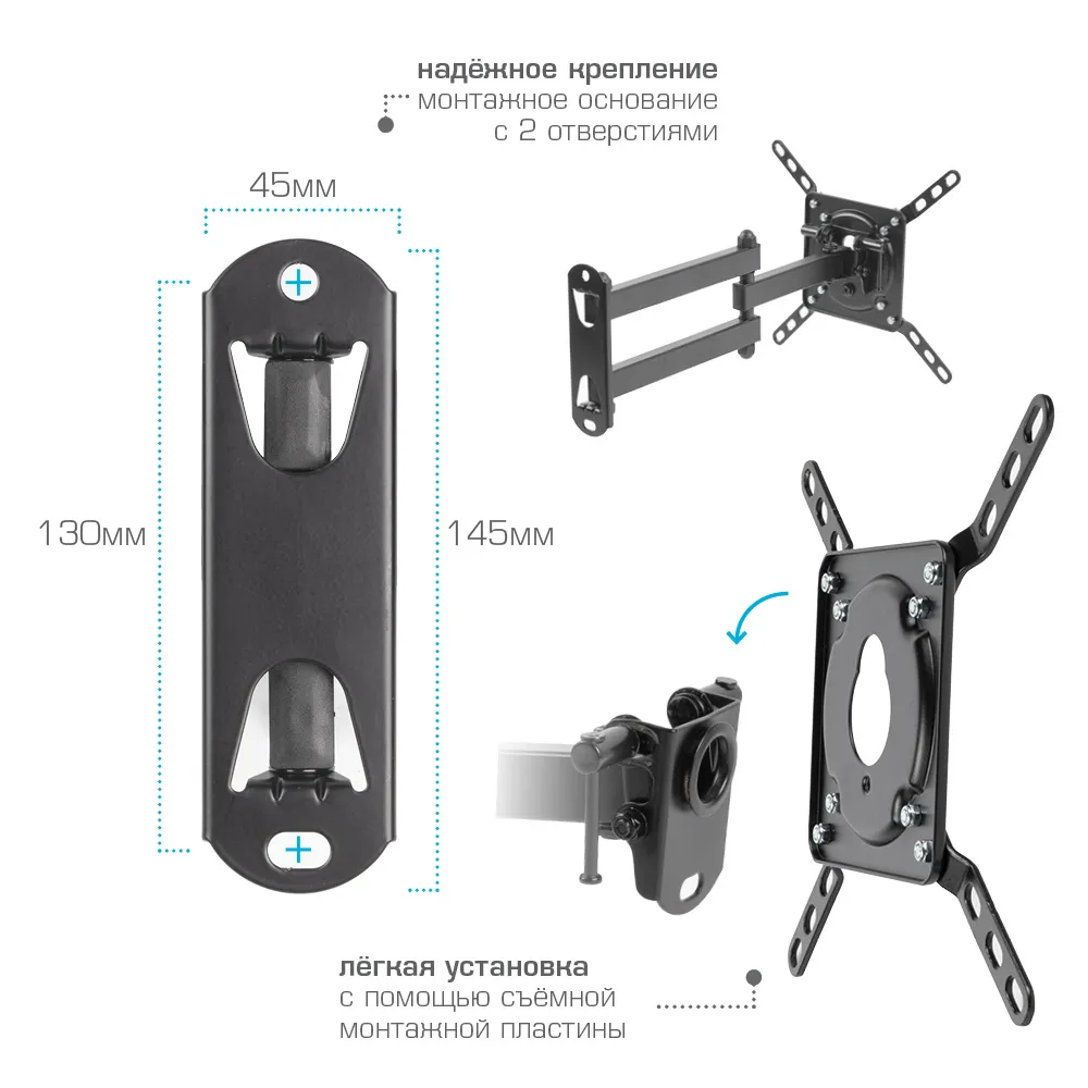 | Дополнительно | Легкий монтаж при помощи съемной монтажной пластины, Надежная стальная конструкция, Универсальный кронштейн - телевизор на кронштейне можно наклонить, повернуть и сдвинуть к стене , Механизм фиксации угла наклона - без использования инструментов |