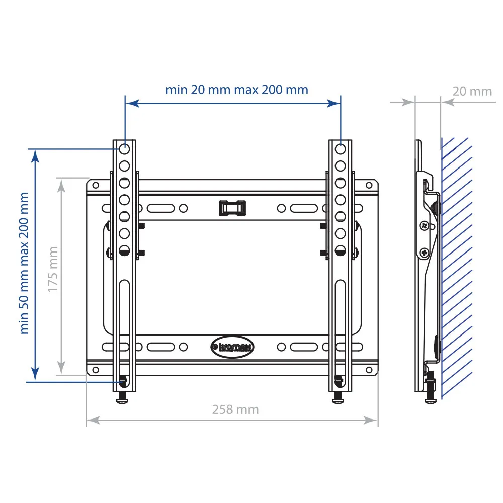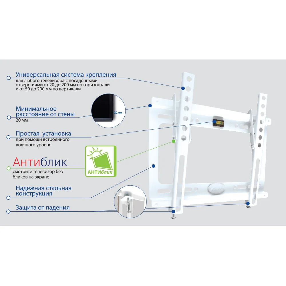 | Дополнительно | Надежная стальная конструкция максимальная нагрузка до 35 кг, Минимальное расстояние до стены 20 мм, Универсальная система крепления, Защита от падения, Простая установка при помощи встроенного водяного уровня |