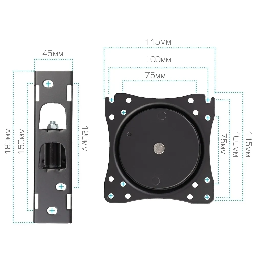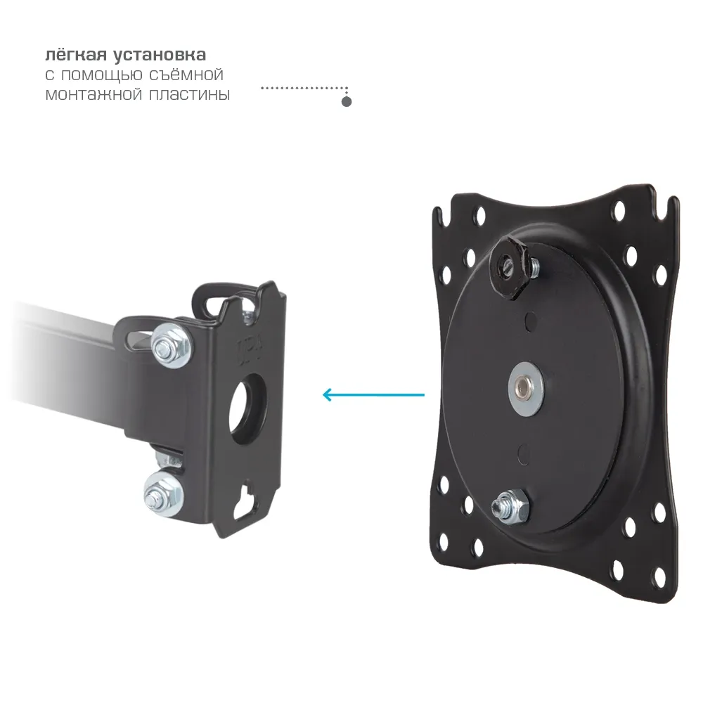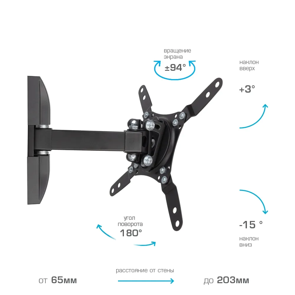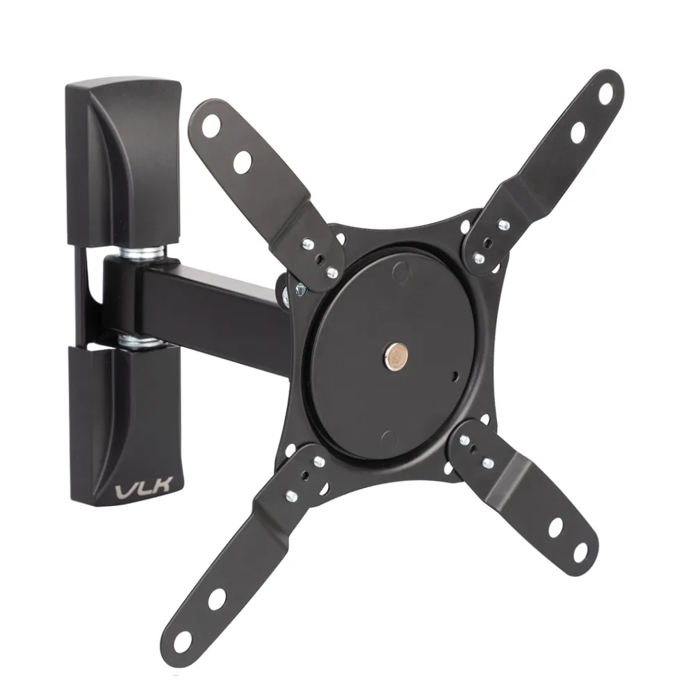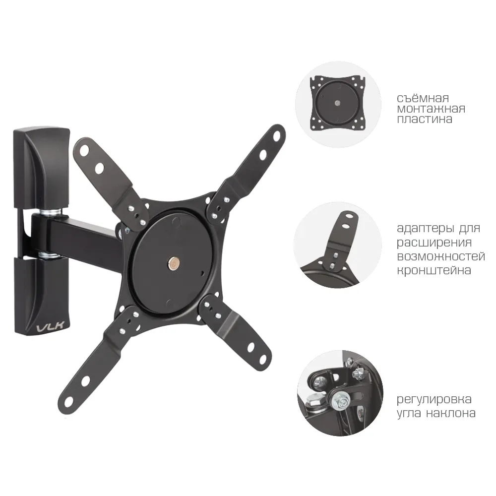 VLK TRENTO-104 BLACK надёжно удержит экран размером 15-42″ и весом 15 кг. Простая конструкция VLK TRENTO-104 BLACK идеально подойдет для самостоятельного монтажа. Наклонно-поворотная регулировка позволит наклонять вверх и вниз на +3 −15°, поворачивать влево и вправо на 180°, и выдвигать на 65-203 мм.