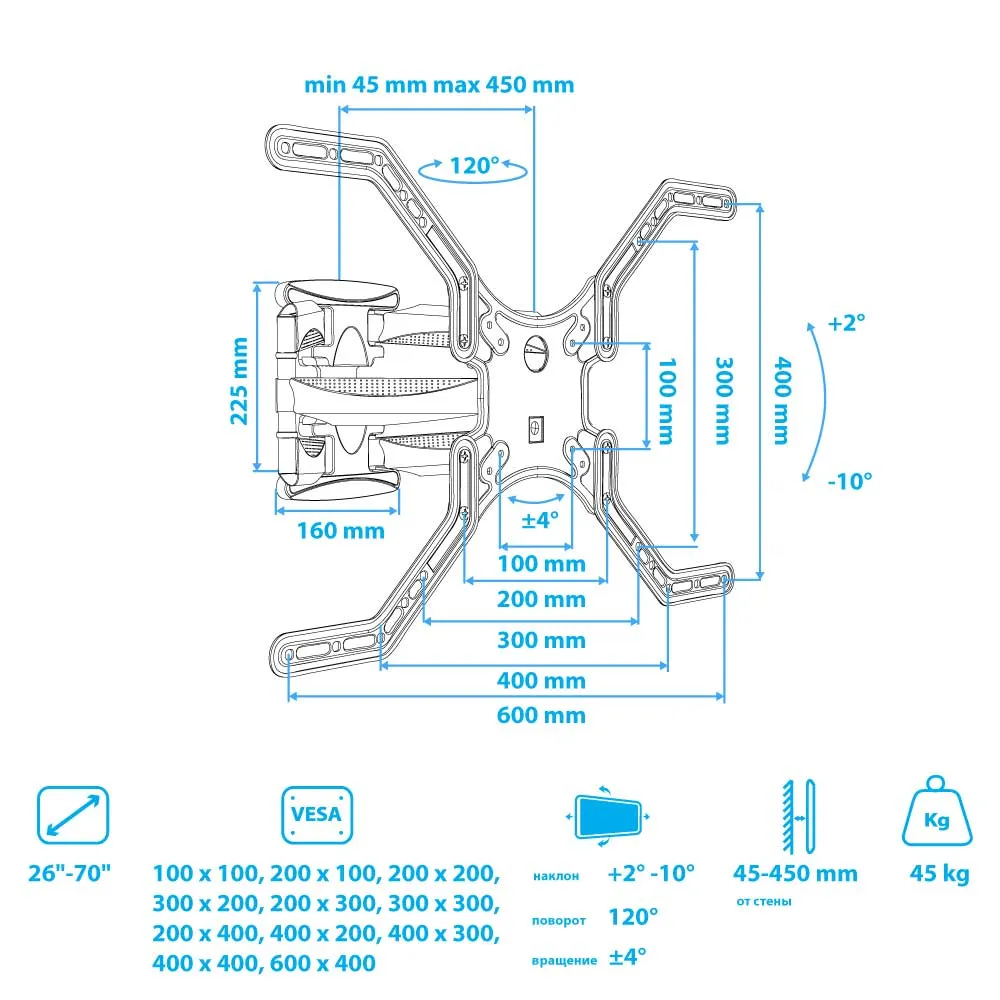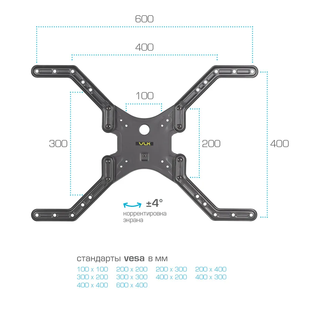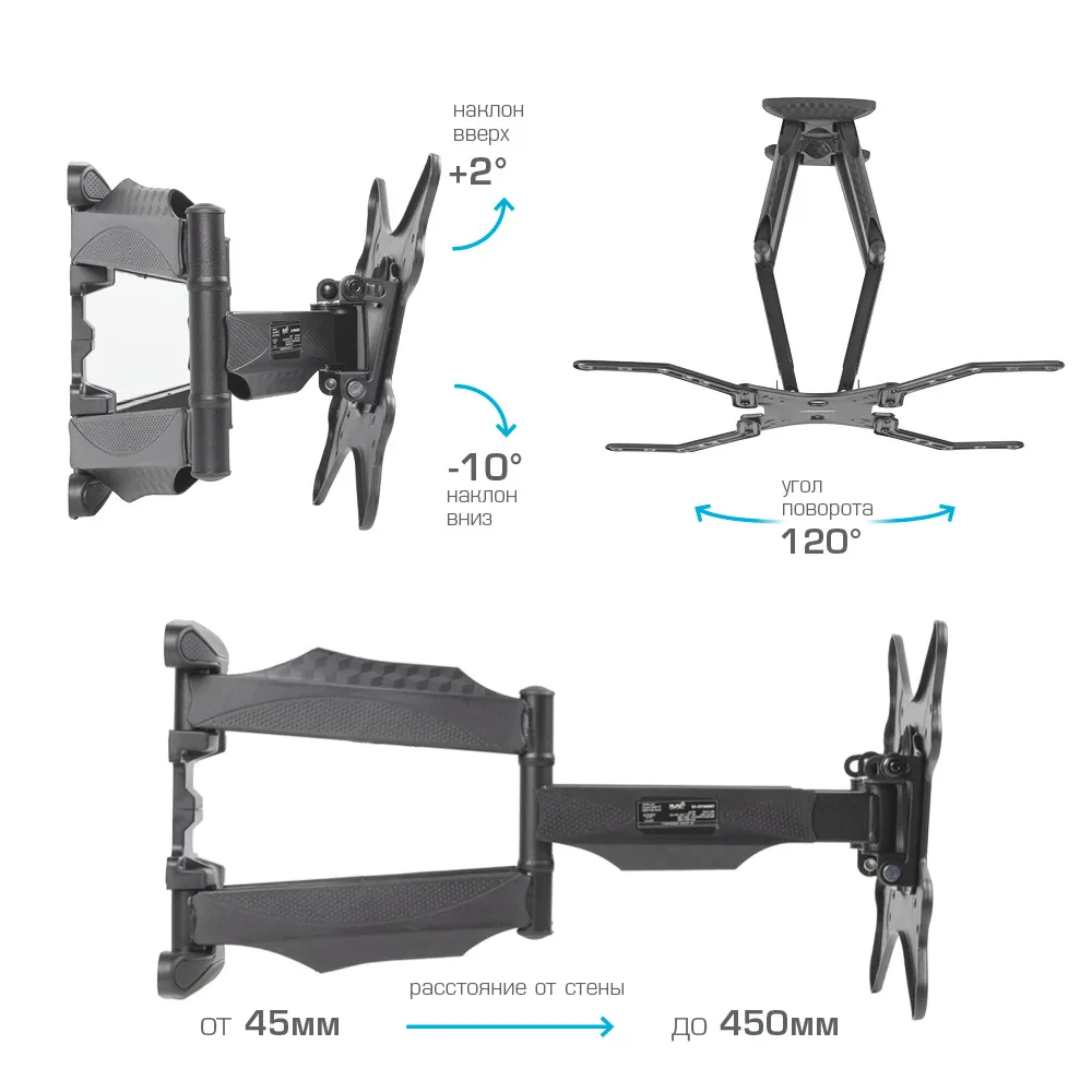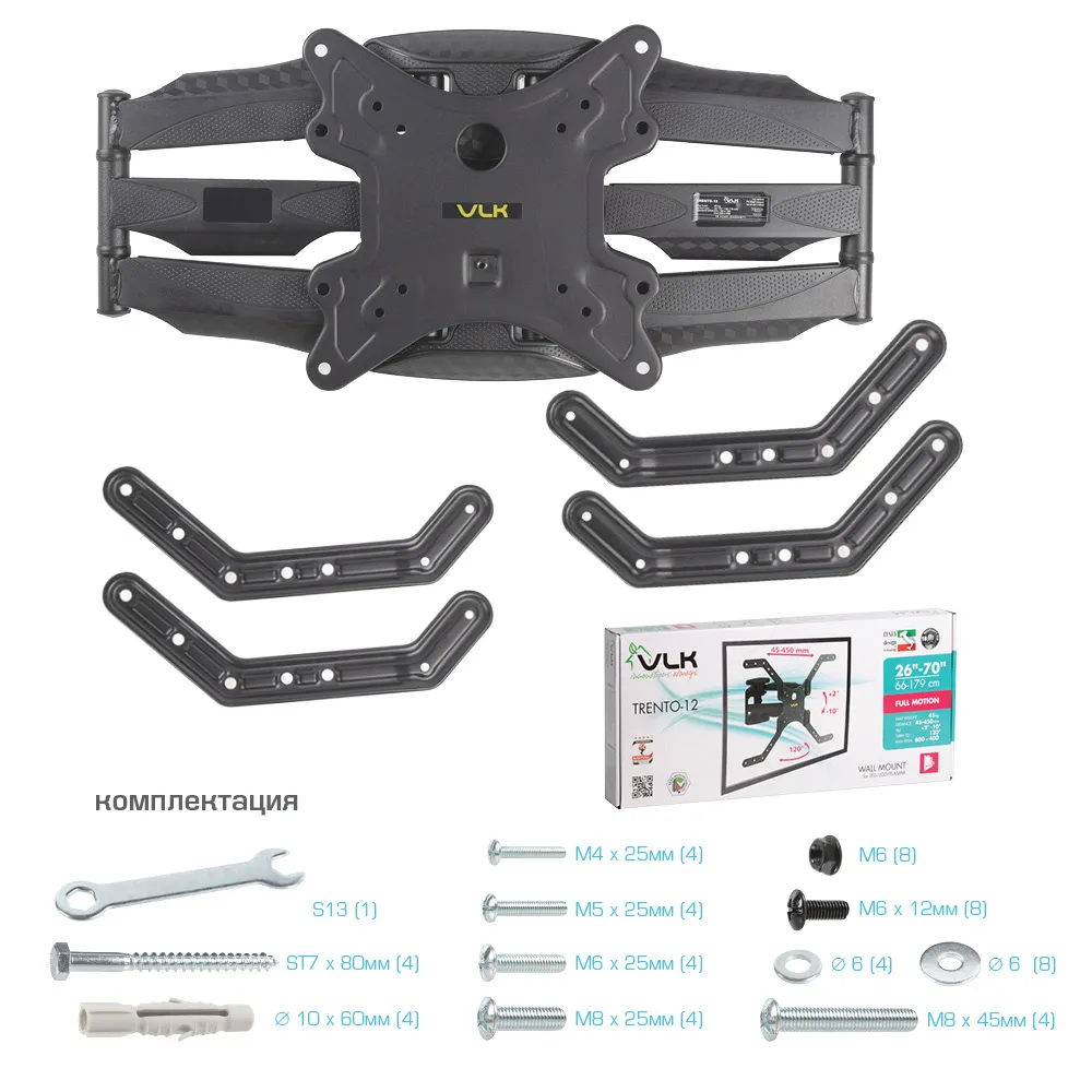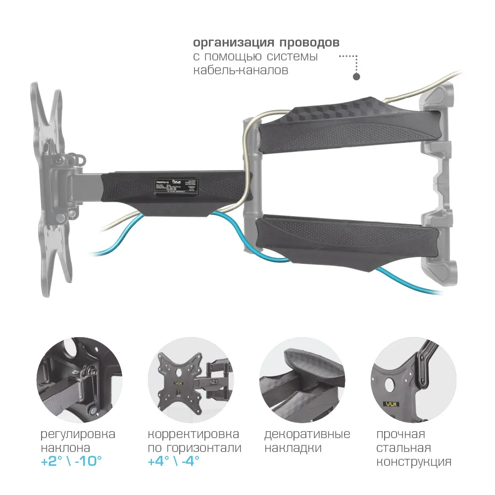 VLK TRENTO-12 BLACK надёжно удержит экран размером 26-70″ и весом 45 кг. Простая конструкция VLK TRENTO-12 BLACK идеально подойдет для самостоятельного монтажа. Наклонно-поворотная регулировка позволит наклонять вверх и вниз на +2 −10°, поворачивать влево и вправо на 120°, и выдвигать на 45-450 мм.