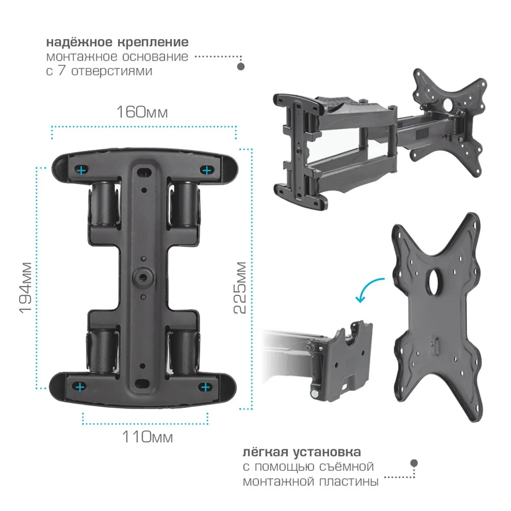 | В комплекте | Кронштейн для телевизора, комплект ключей и крепежа для установки ТВ, навесной уровень, подробная инструкция на русском языке |
