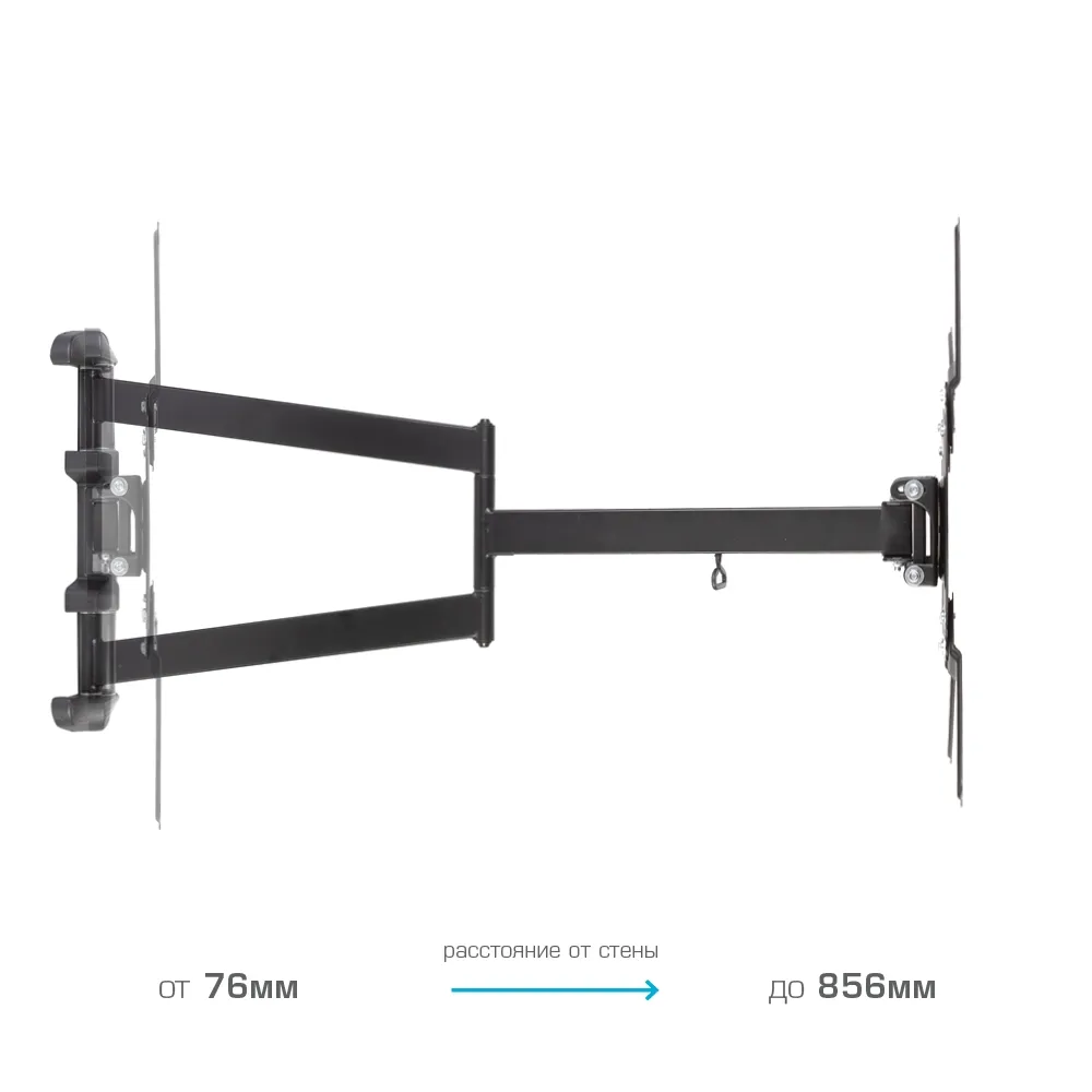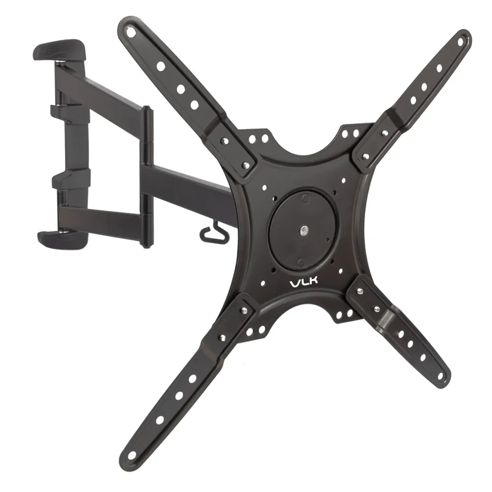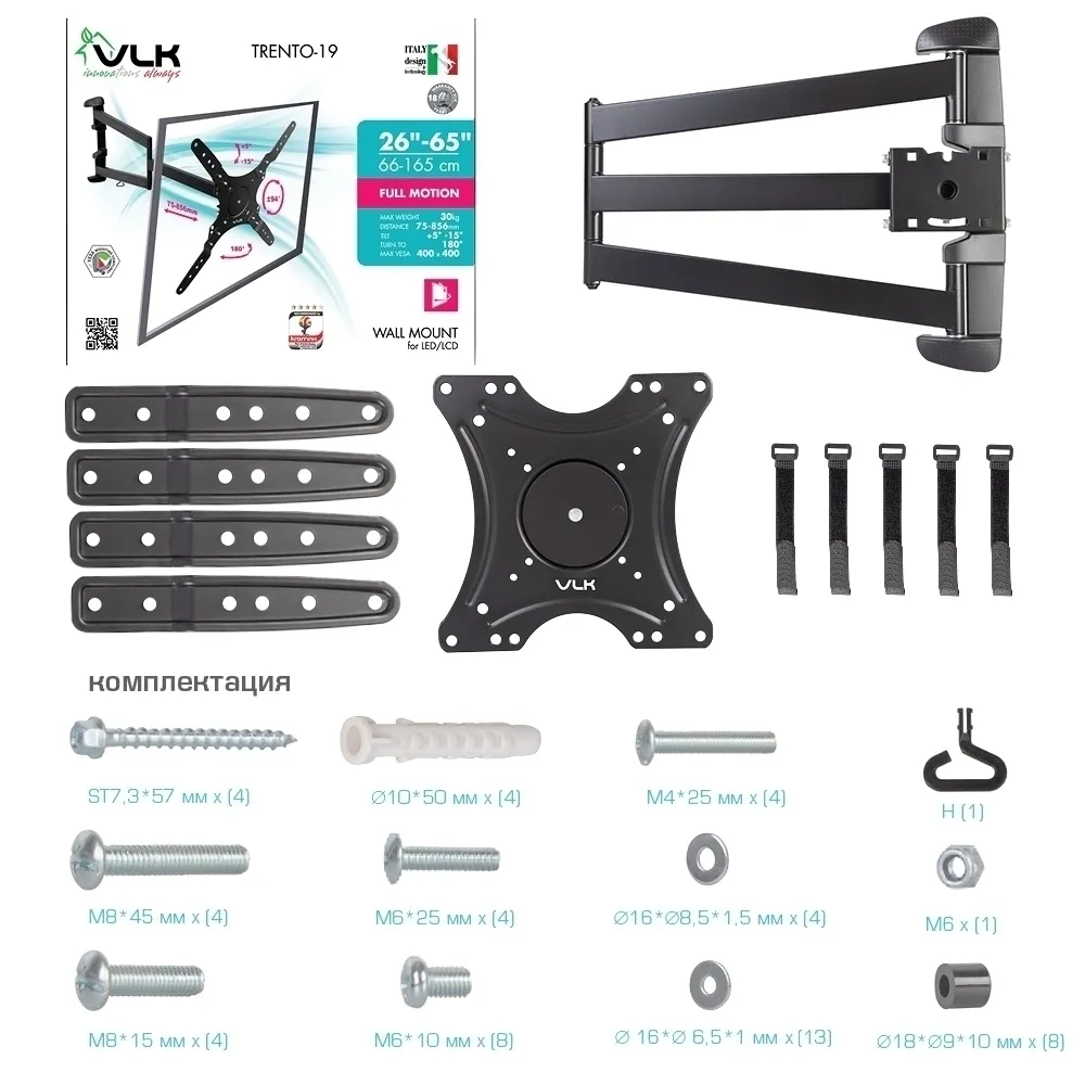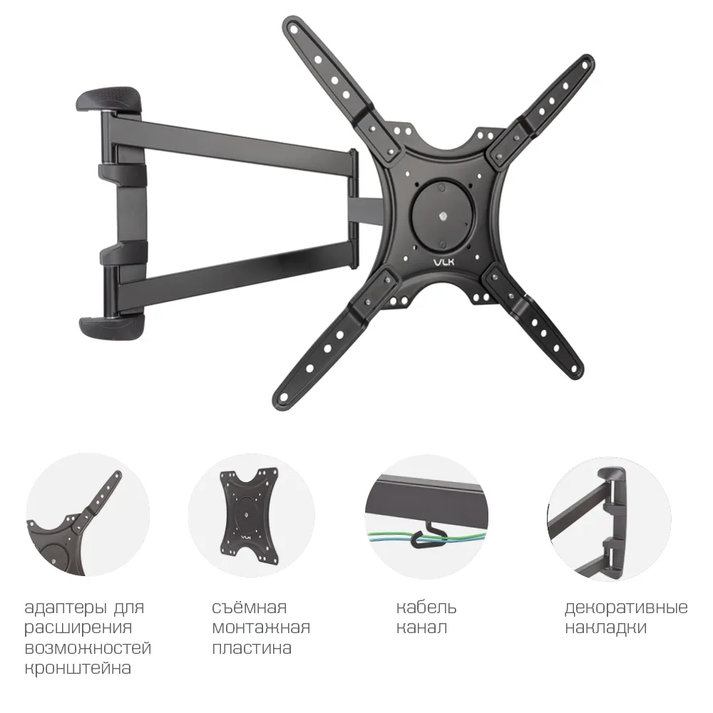 VLK TRENTO-19 BLACK надёжно удержит экран размером 26-65″ и весом 30 кг. Простая конструкция VLK TRENTO-19 BLACK идеально подойдет для самостоятельного монтажа. Наклонно-поворотная регулировка позволит наклонять вверх и вниз на +5 −10°, поворачивать влево и вправо на 180°, и выдвигать на 76-856 мм.