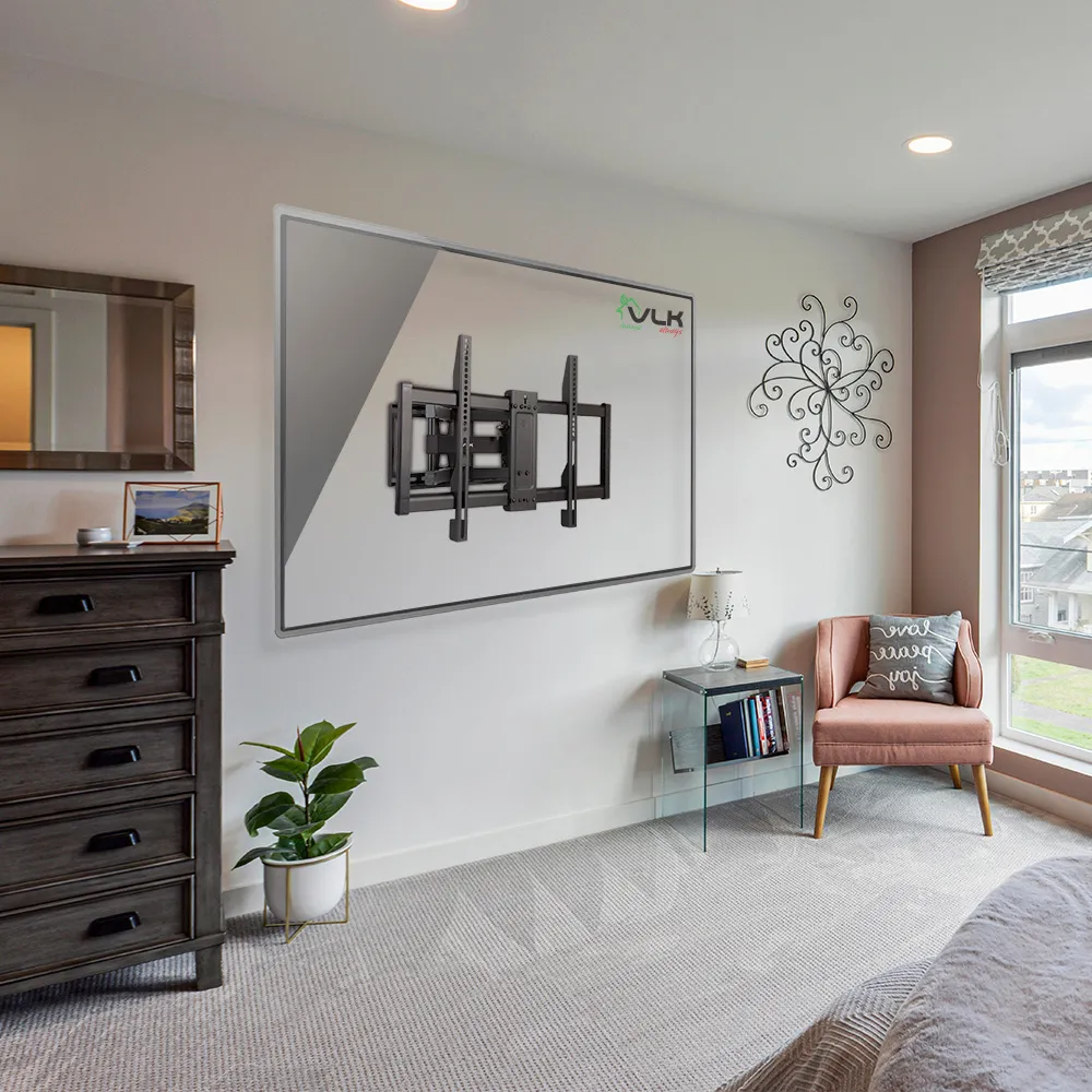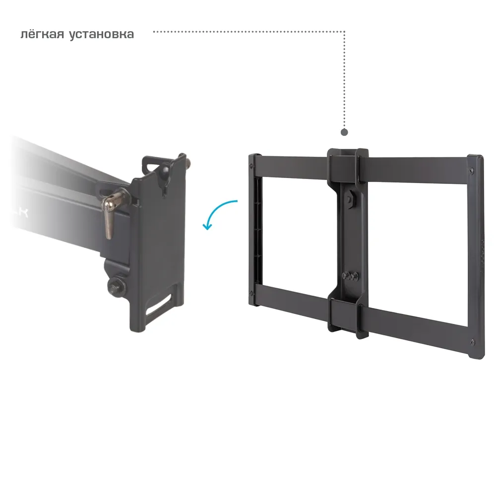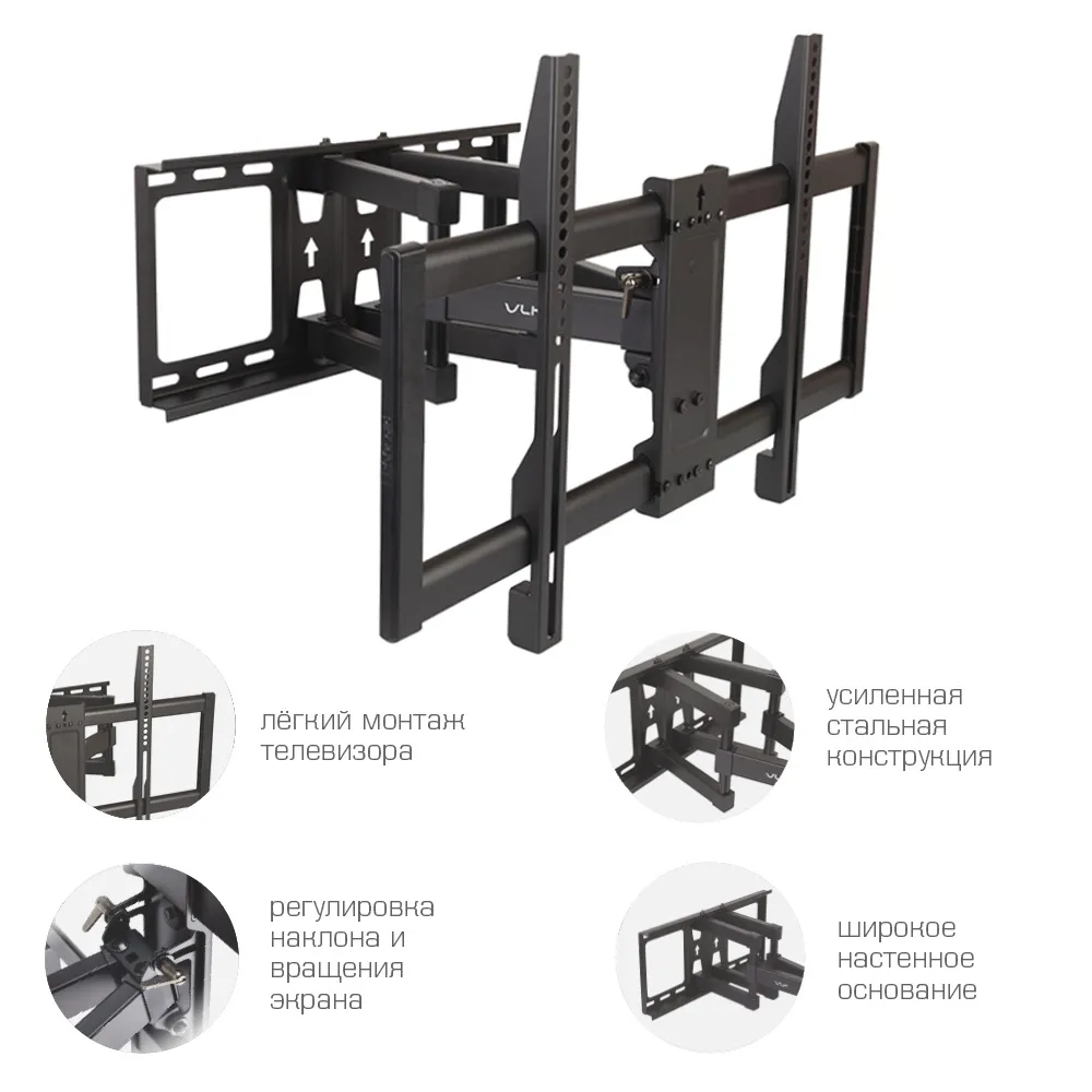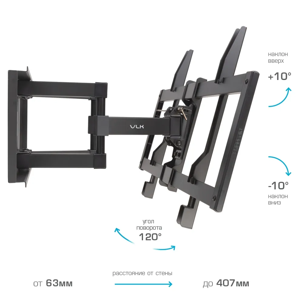 VLK TRENTO-20 BLACK надёжно удержит экран размером 26-90″ и весом 45 кг. Простая конструкция VLK TRENTO-20 BLACK идеально подойдет для самостоятельного монтажа. Наклонно-поворотная регулировка позволит наклонять вверх и вниз на ±10°, поворачивать влево и вправо на 120°, и выдвигать на 63-407 мм.