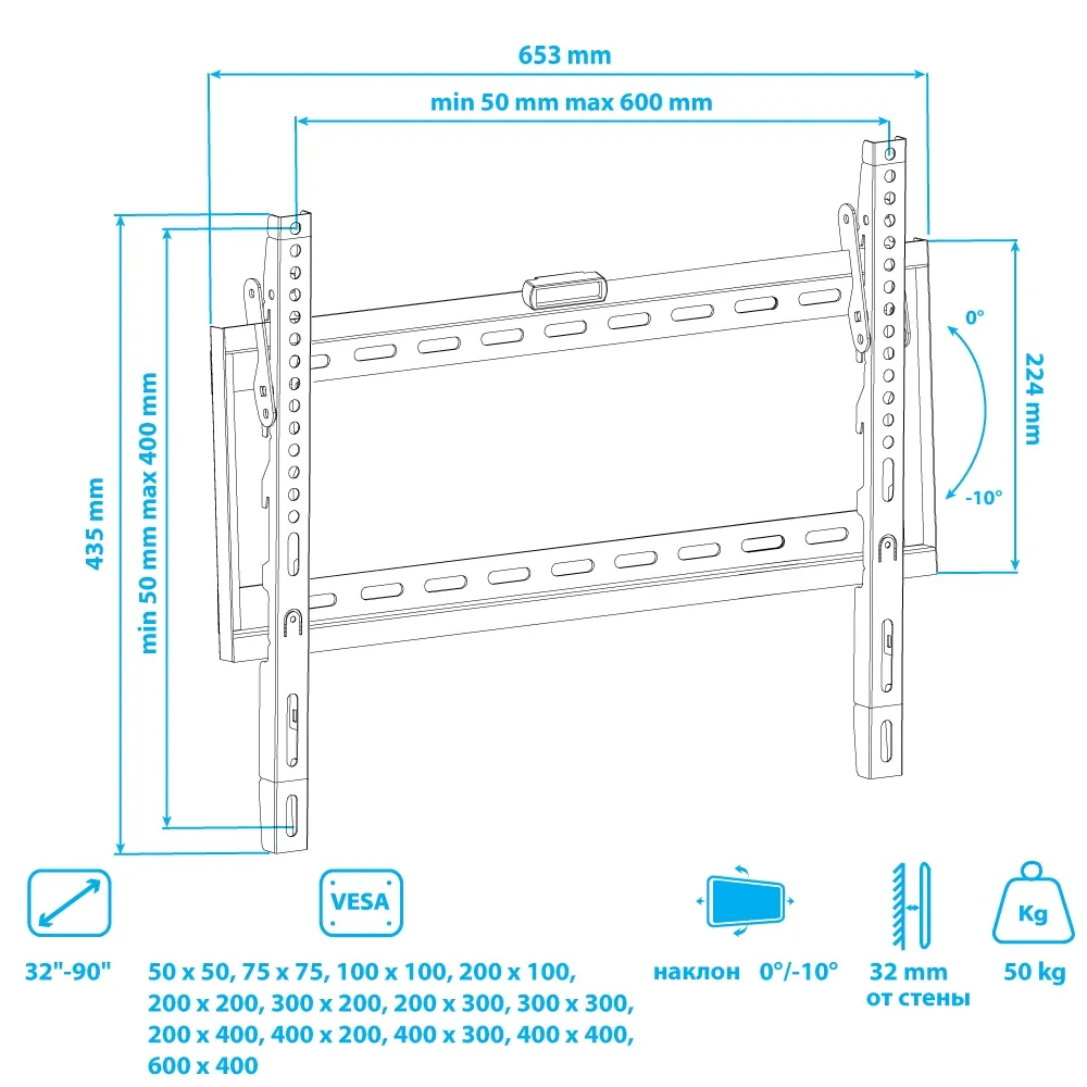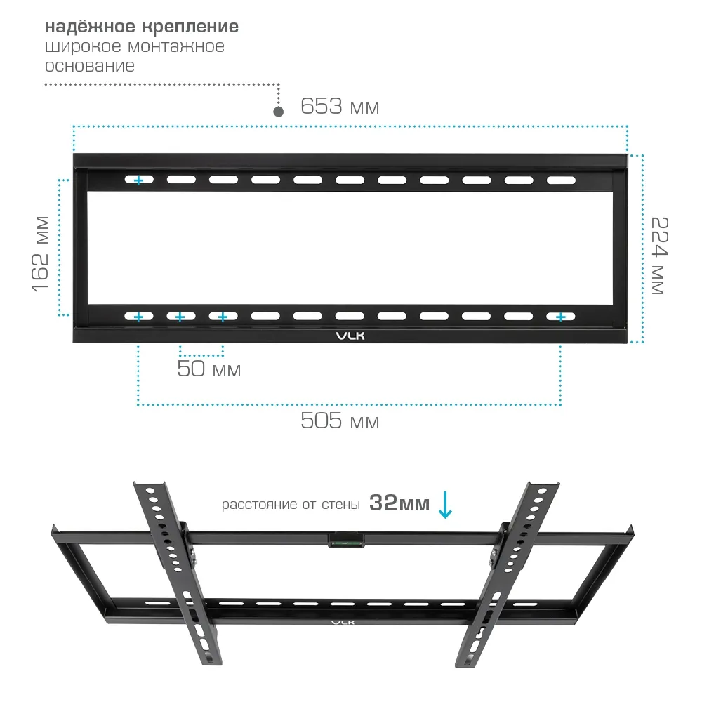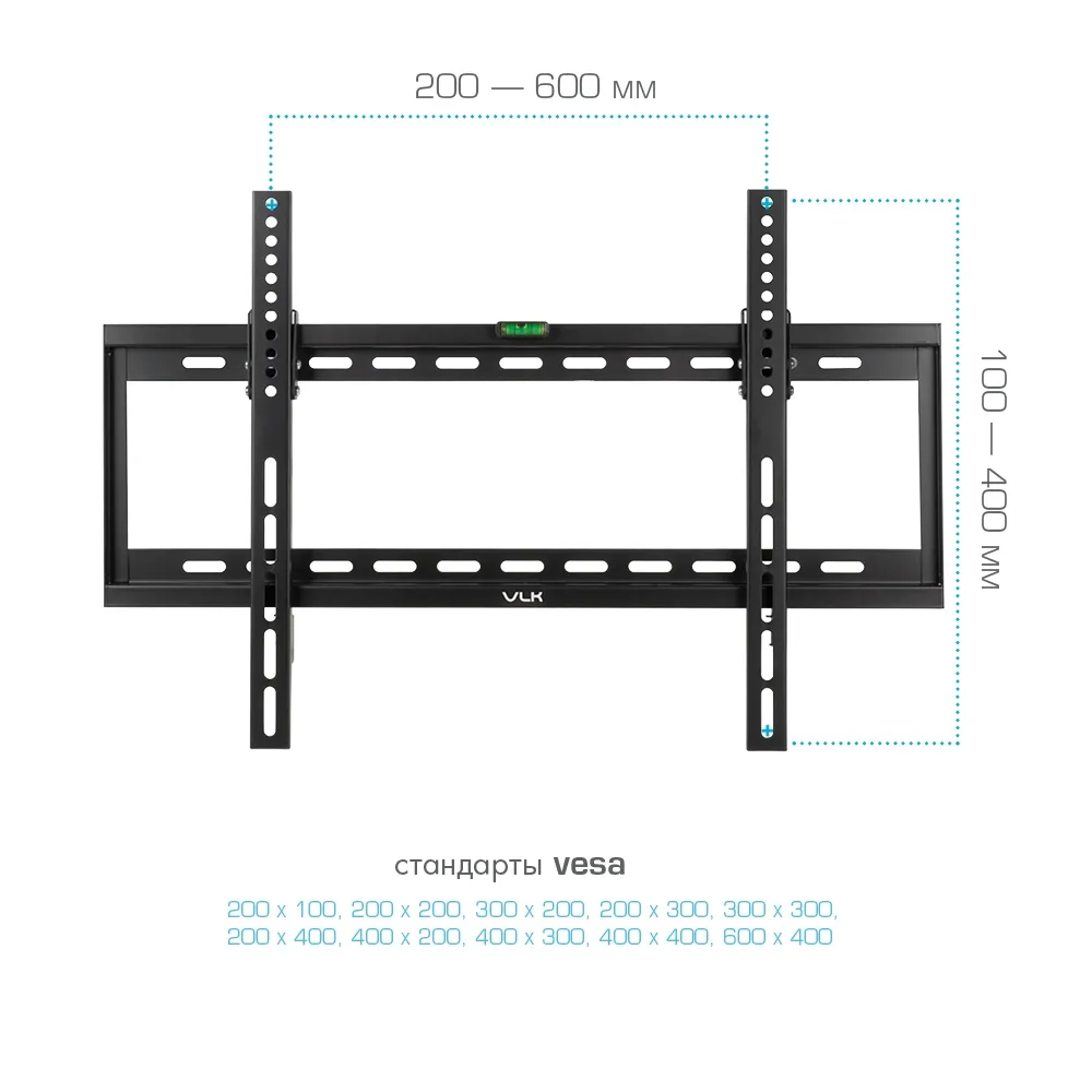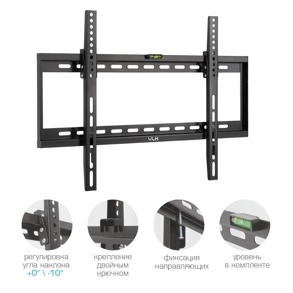 VLK TRENTO-32 BLACK надёжно удержит экран размером 32-90″ и весом 50 кг. Простая конструкция VLK TRENTO-32 BLACK идеально подойдет для самостоятельного монтажа. Наклонная конструкция регулировать экран вверх и вниз на 0 -10°.