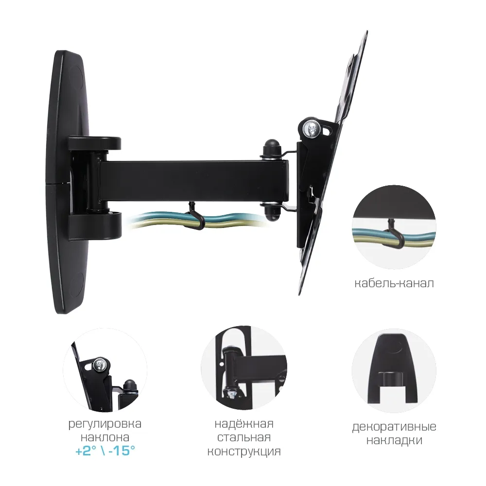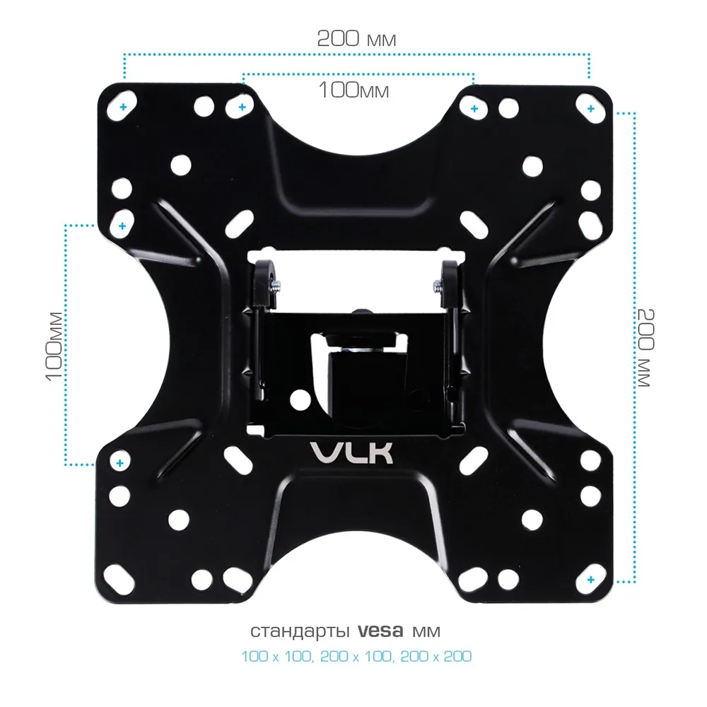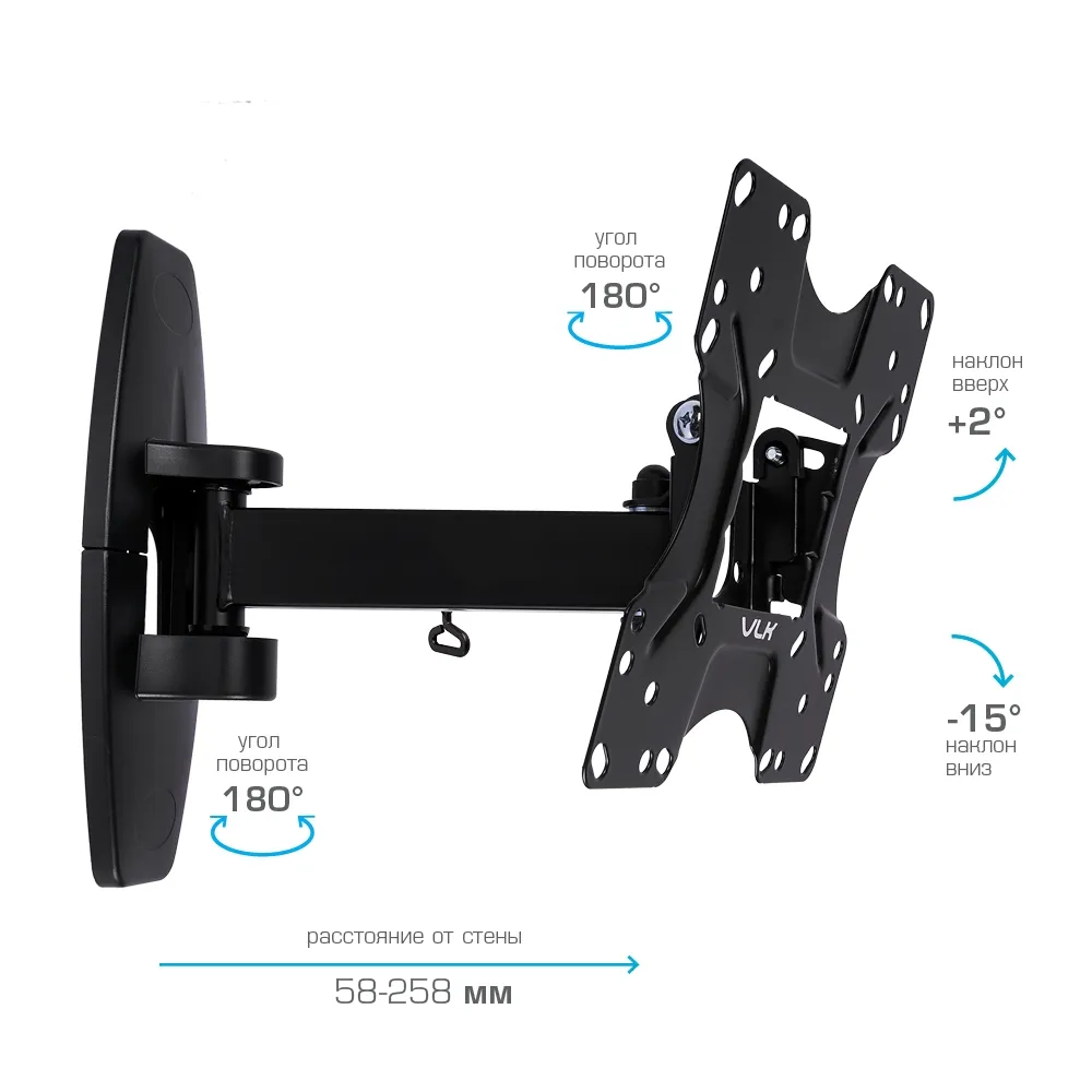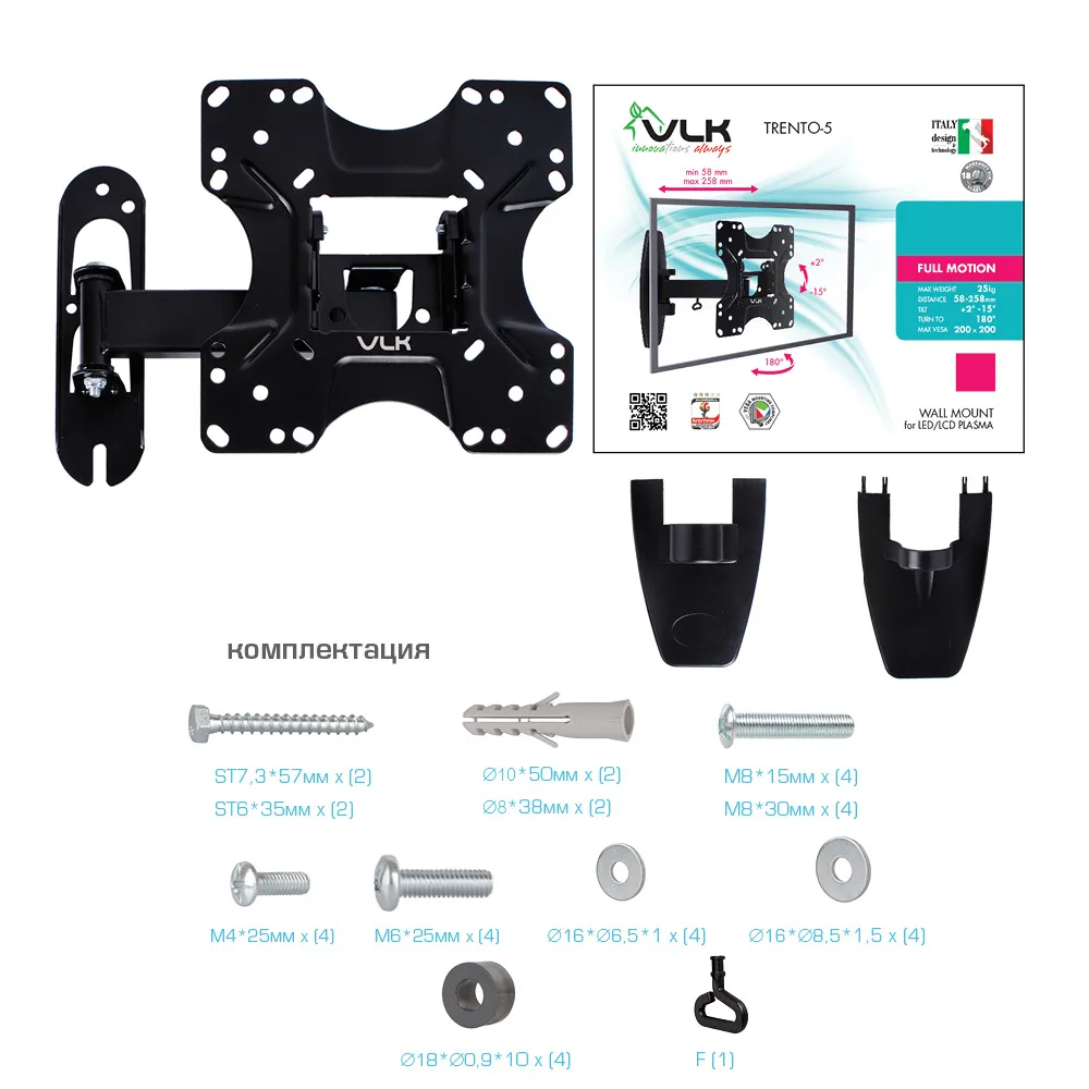 VLK TRENTO-5 BLACK надёжно удержит экран размером 20-43″ и весом 25 кг. Простая конструкция VLK TRENTO-5 BLACK идеально подойдет для самостоятельного монтажа. Наклонно-поворотная регулировка позволит наклонять вверх и вниз на +2 −15°, поворачивать влево и вправо на 180°, и выдвигать на 58-258 мм.