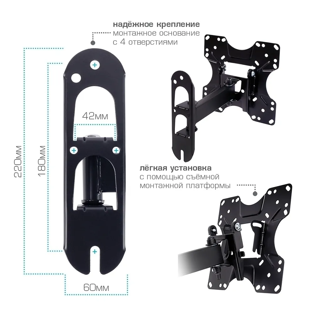 | В комплекте | Кронштейн для телевизора, комплект крепежа для установки ТВ, подробная инструкция на русском языке |