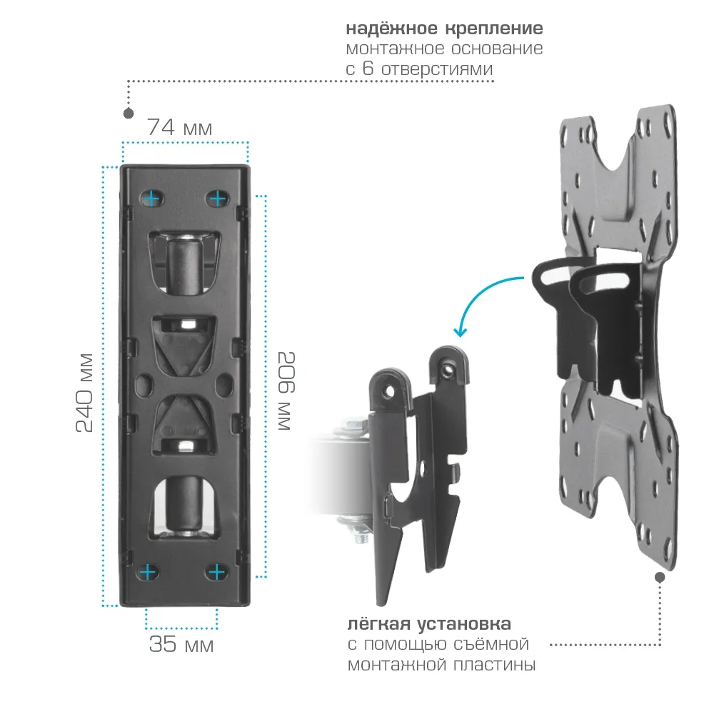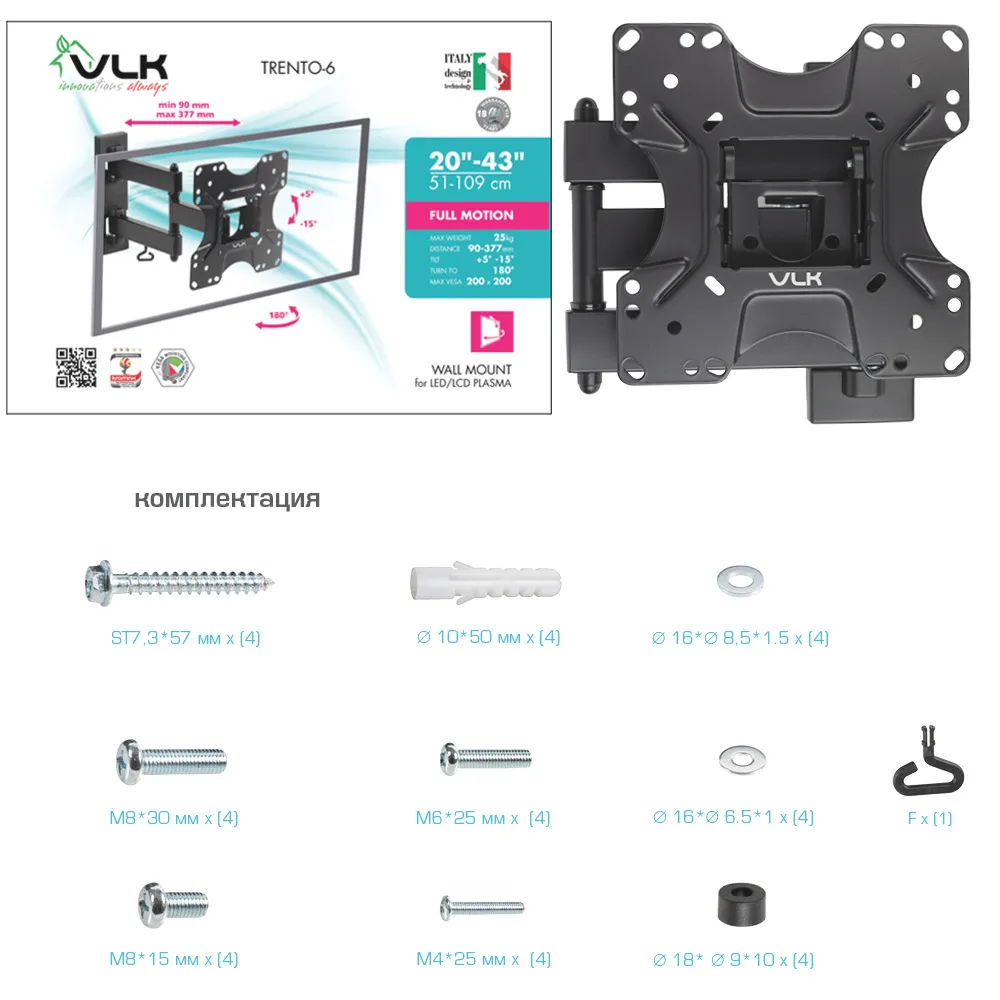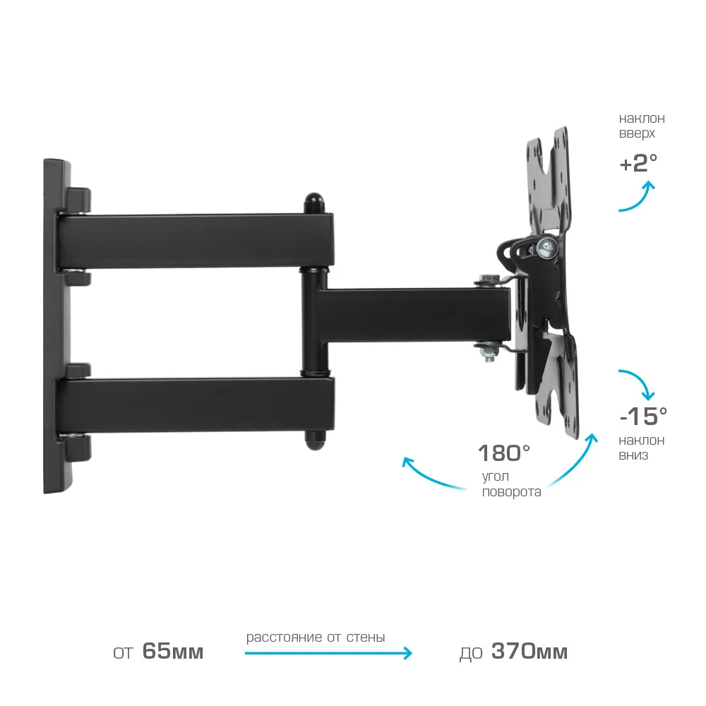 VLK TRENTO-6 BLACK надёжно удержит экран размером 20-43″ и весом 25 кг. Простая конструкция VLK TRENTO-6 BLACK идеально подойдет для самостоятельного монтажа. Наклонно-поворотная регулировка позволит наклонять вверх и вниз на +2 −15°, поворачивать влево и вправо на 180°, и выдвигать на 65-370 мм.